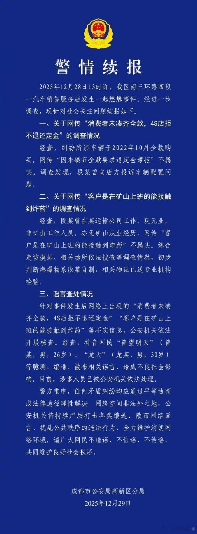 成都丰田4S店爆炸案。据说身体绑着自制的炸药,然后矛盾爆发,这个老哥就真的引爆了身上的炸药。这是何苦。有矛盾,用惩罚自己来威胁别人,是最不值得的行为。真的电视看多了,那些电视里面的,绑着炸药威胁别人的场景,现实中很难复刻的……