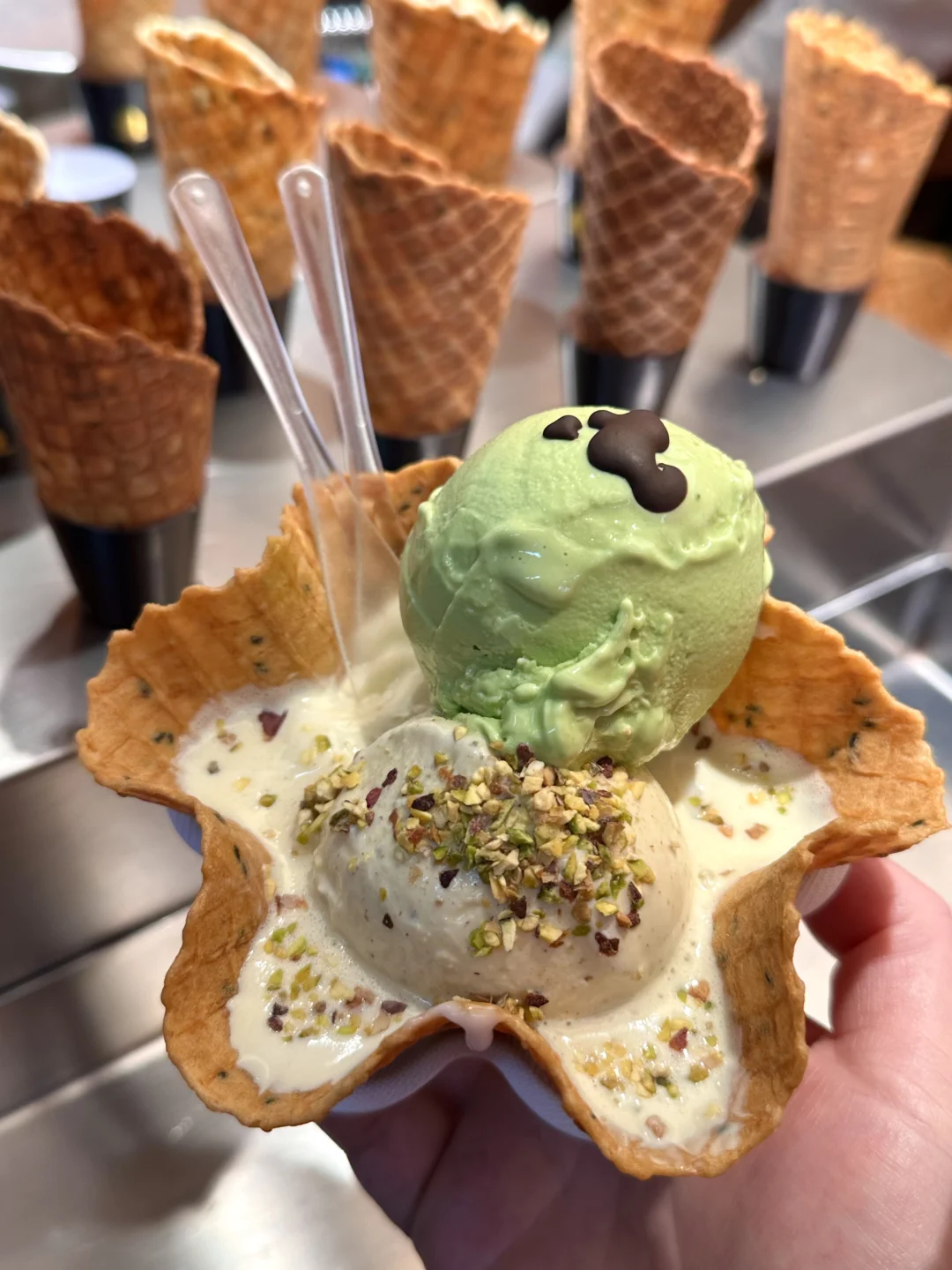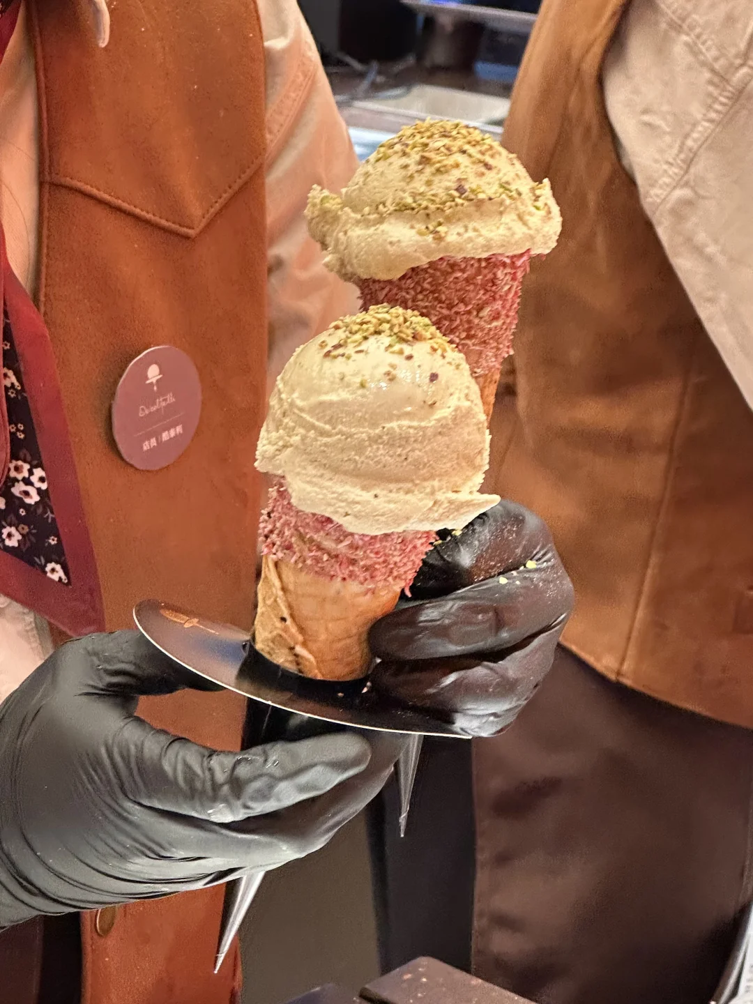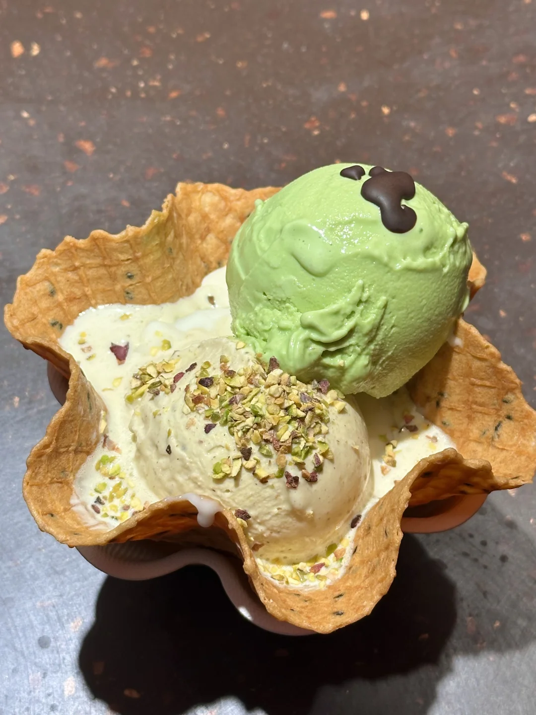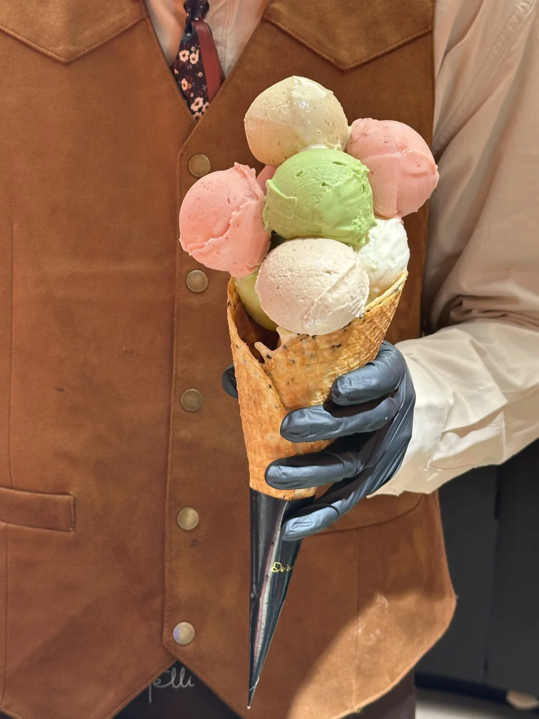 新百负一楼!意大利手工冰淇淋 每天现做的 所以随机五六种口味! 榴莲的9.9 真榴莲做的就是不一样😭 好久没吃过这种真材实料的gelato了 蛋卷皮也是现场现做的 奶香十足