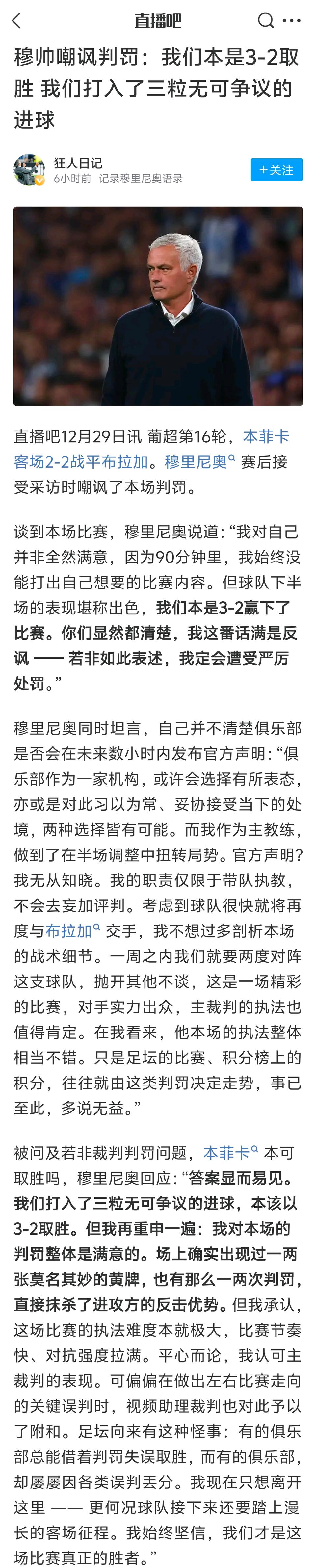 穆里尼奥还是老样子,嘲讽裁判的不公平。 目前他的葡萄牙体育41分,排在葡超第二。 波尔图43分葡超第一,这两队争冠。 所以一场平局,穆帅损失2分,得骂一骂。[笑哭]