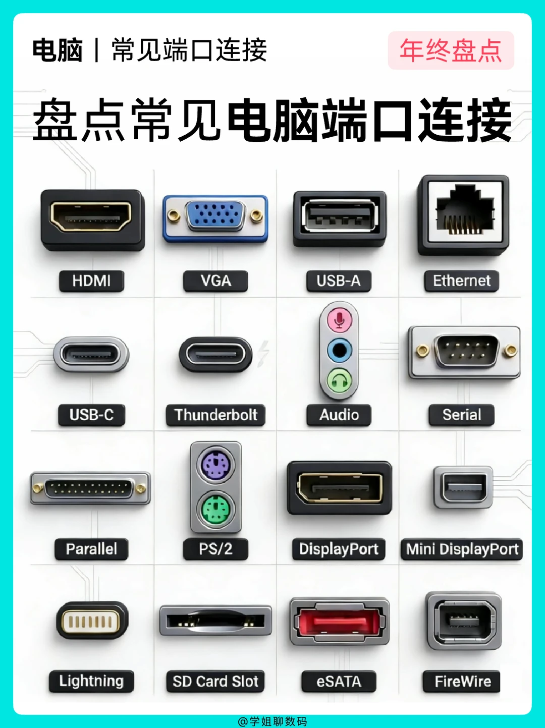 并行端口(DB25):旧式打印机接口,现已几乎淘汰。