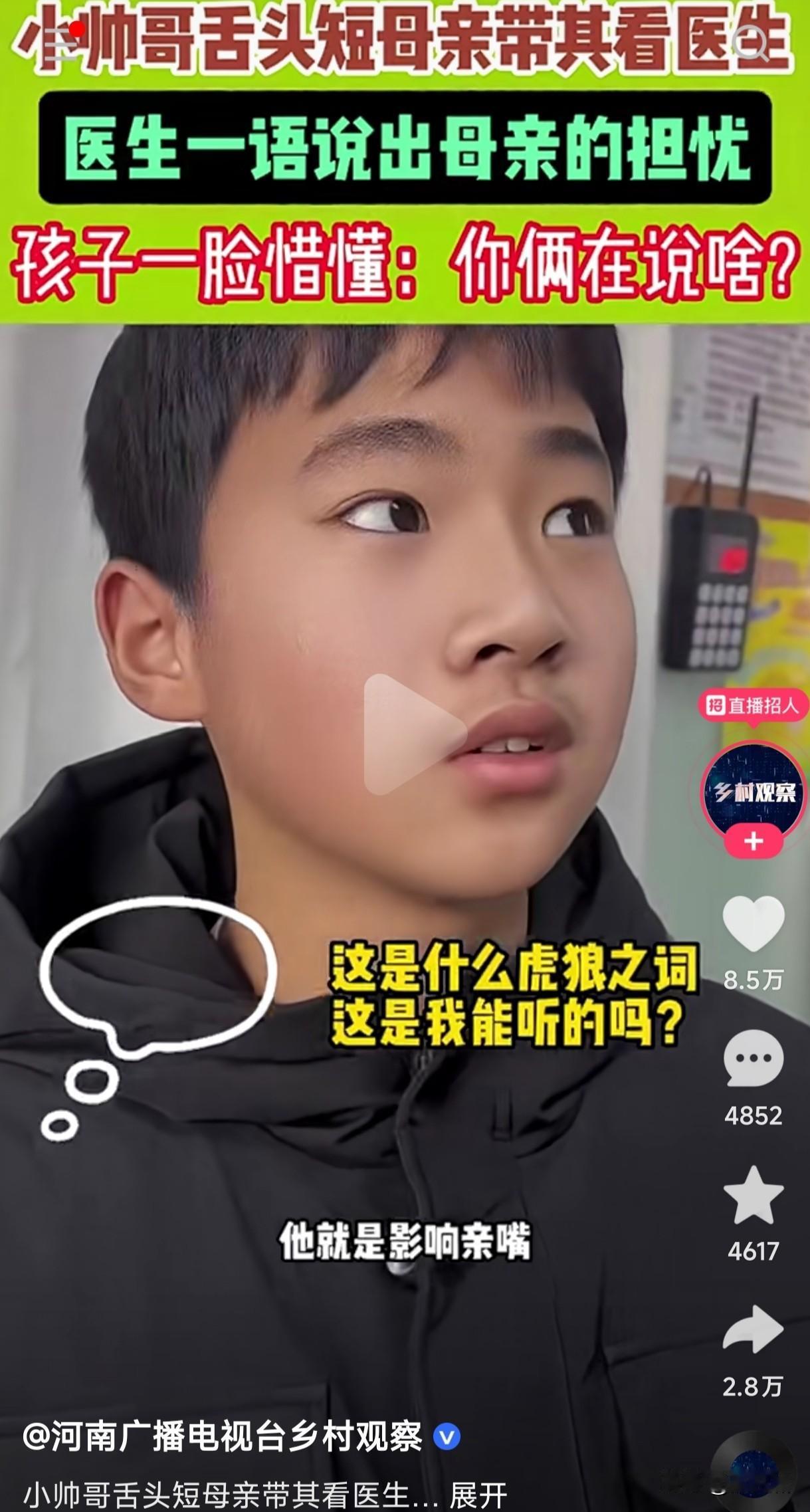 儿子舌头短伸不出嘴里母亲带他去看医生,检查完各方面都没有问题,医生对孩子母亲说其它的没有影响,就是影响亲嘴,孩子母亲说我就是担心这个啊…… 果然还是当娘的最操心,孩子舌头短不影响说话,也不影响吃饭喝水,可是舌头太短就是从嘴里伸不出去,当娘的也算是过来人,这其它的啥都不影响,就是以后长大了会影响亲嘴,果然这当娘的担心还真和医生检查的一样,啥都不影响,唯独影响亲嘴,话说这亲嘴就亲嘴,伸舌头干什么? 这孩子长大找女朋友亲嘴不伸舌头会不会被对方认为是不爱她呢?或者说他亲嘴的时候伸不出舌头,会不会责怪母亲当初带他看医生的时候没有给他好好治疗?