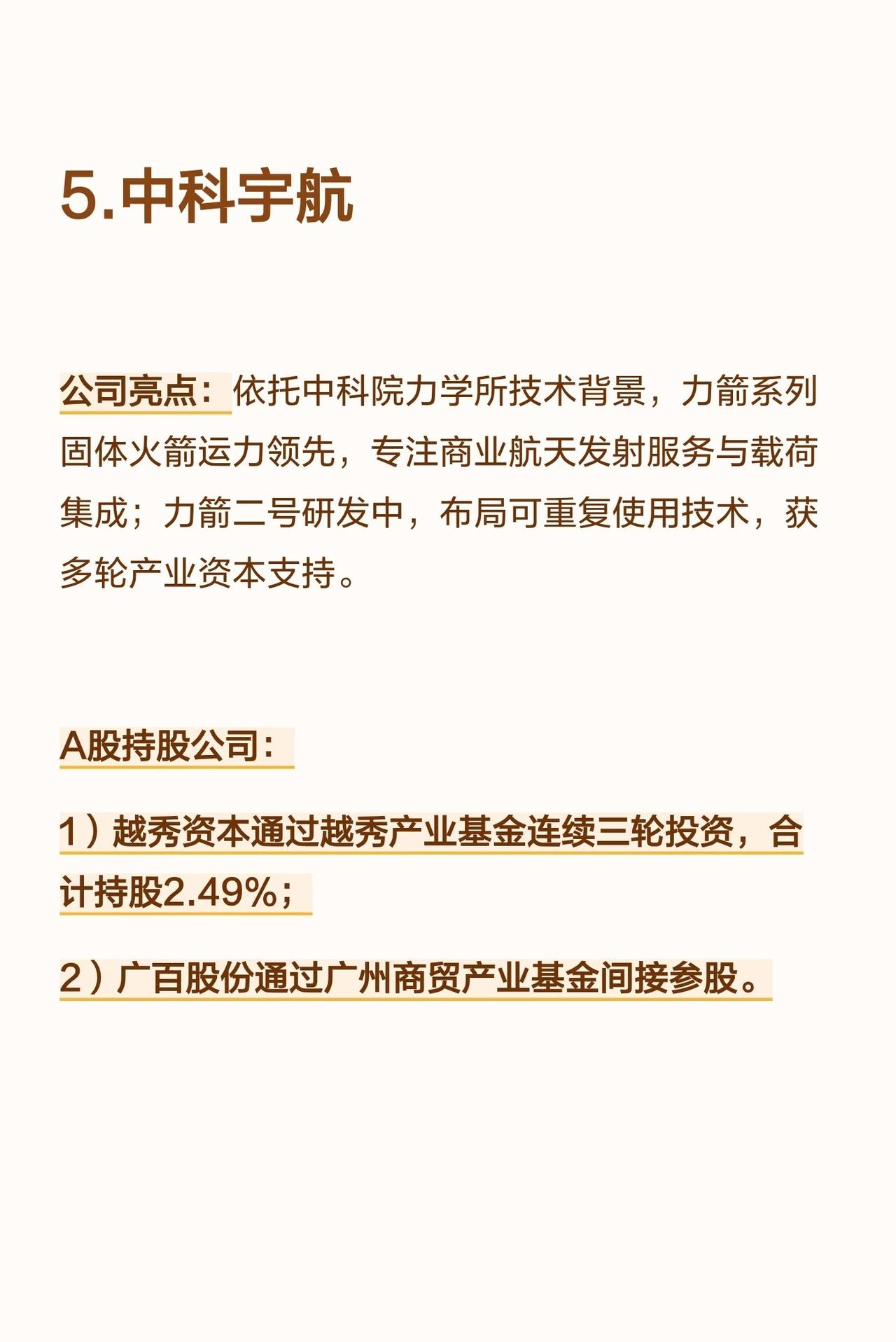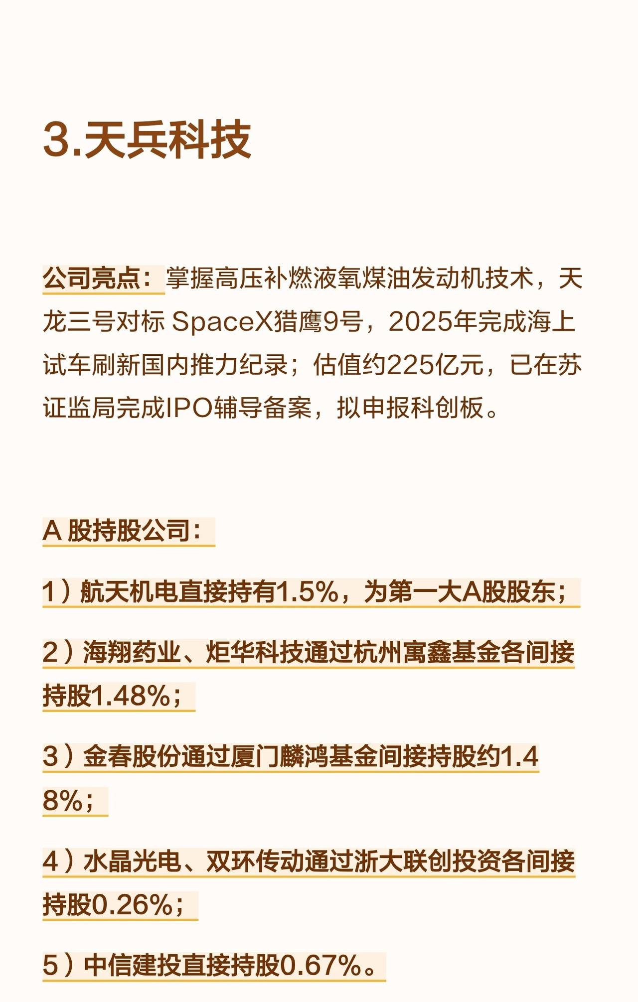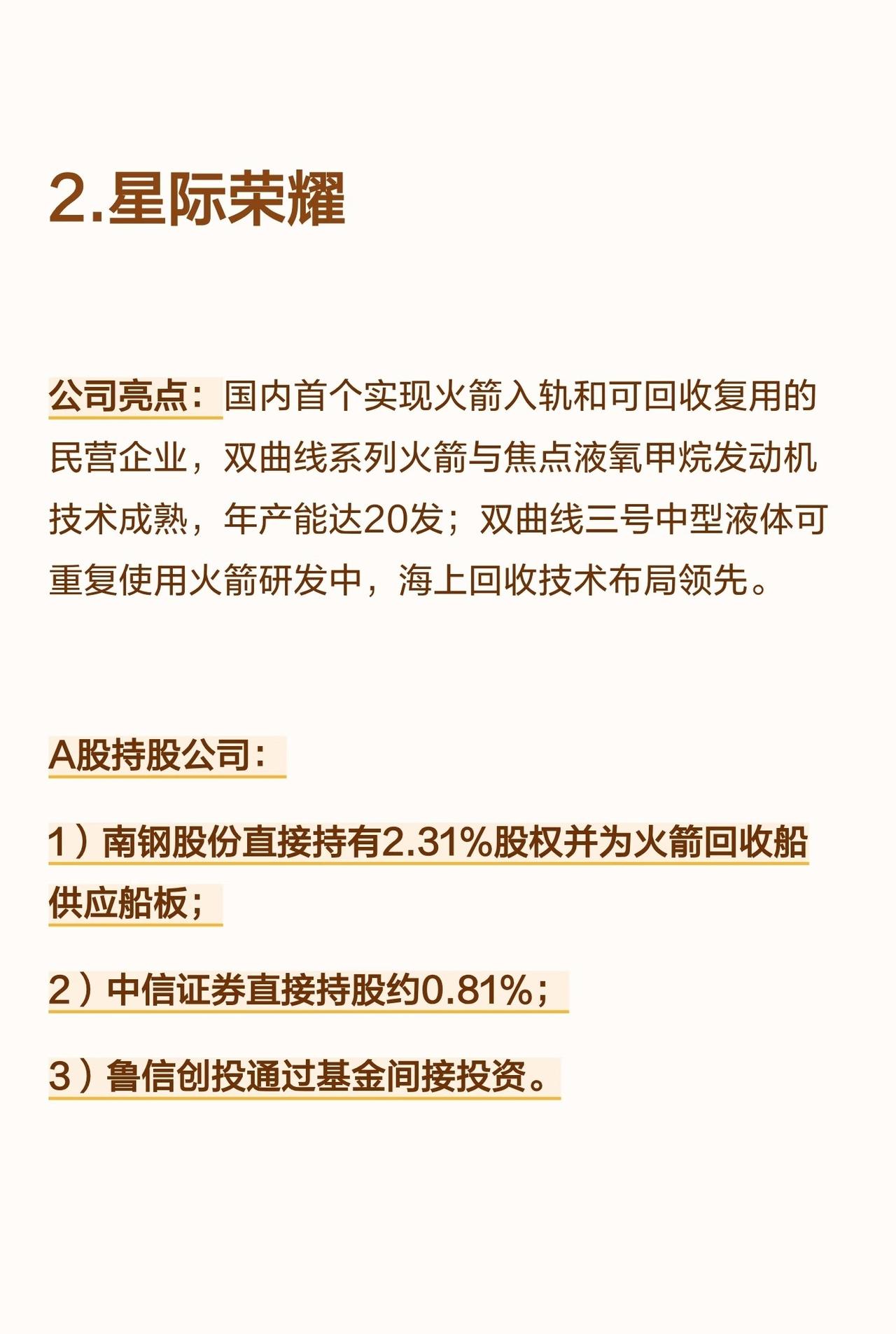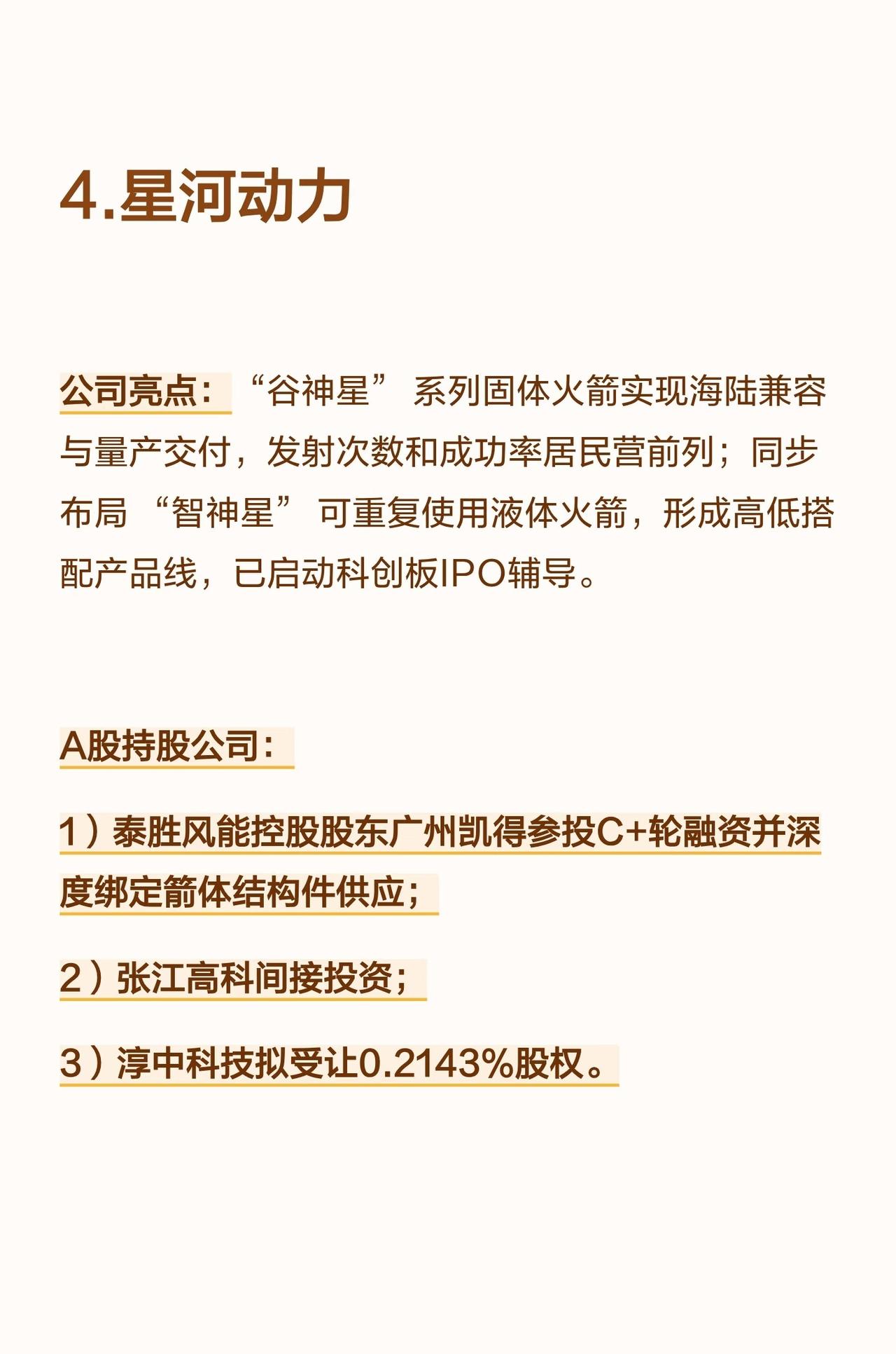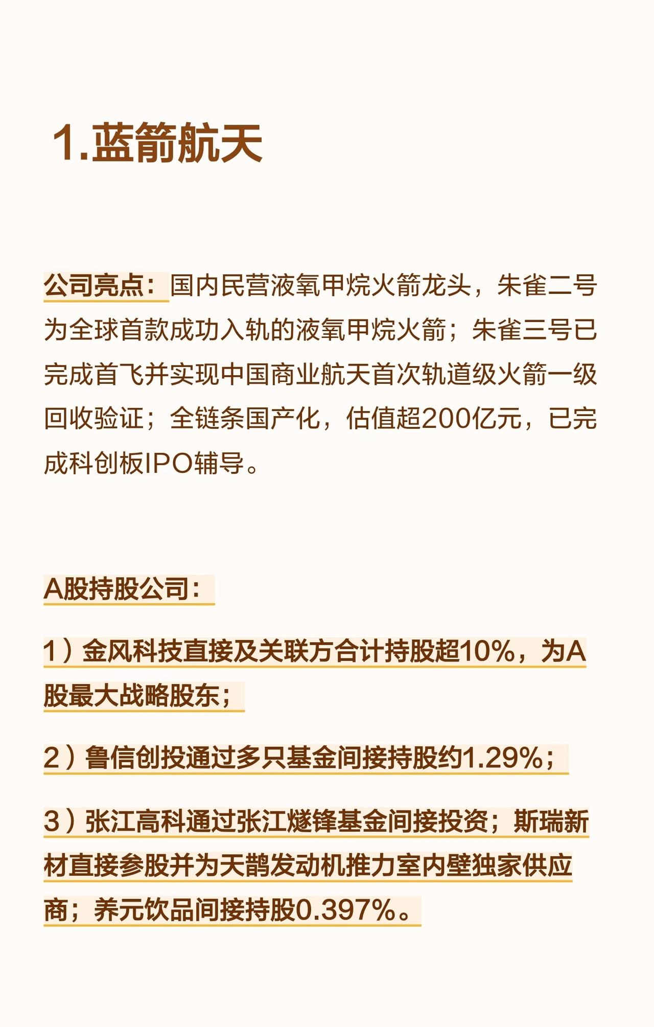 国内商业航天领域有五家企业正冲刺IPO,分别为蓝箭航天、星际荣耀、天兵科技、星河动力及中科宇航,以下是对它们的具体解析: 首先是蓝箭航天,它是国内民营液氧甲烷火箭龙头企业,旗下朱雀二号为全球首款成功入轨的液氧甲烷火箭,朱雀三号已完成首飞并实现中国商业航天首次轨道级火箭一级回收验证,全链条实现国产化,估值超200亿元,且已完成科创板IPO辅导。在A股持股公司中,金风科技直接及关联方合计持股超10%,是A股最大战略股东;鲁信创投通过多只基金间接持股约1.29%;张江高科通过张江燧锋基金间接投资,斯瑞新材直接参股并为天鹊发动机推力室内壁独家供应商,养元饮品间接持股0.397%。 第二家是星际荣耀,作为国内首个实现火箭入轨和可回收复用的民营企业,其双曲线系列火箭与焦点液氧甲烷发动机技术成熟,年产能达20发,目前正在研发双曲线三号中型液体可重复使用火箭,且在海上回收技术布局上处于领先地位。A股持股公司里,南钢股份直接持有2.31%股权并为火箭回收船供应船板;中信证券直接持股约0.81%;鲁信创投通过基金间接投资。 第三家为天兵科技,它掌握了高压补燃液氧煤油发动机技术,天龙三号对标SpaceX猎鹰9号,计划2025年完成海上试车以刷新国内推力纪录,当前估值约225亿元,已在苏证监局完成IPO辅导备案,拟申报科创板。A股持股公司中,航天机电直接持有1.5%,为第一大A股股东;海翔药业、炬华科技通过杭州寓鑫基金各间接持股1.48%;金春股份通过厦门麟鸿基金间接持股约1.48%;水晶光电、双环传动通过浙大联创投资各间接持股0.26%;中信建投直接持股0.67%。 第四家是星河动力,“谷神星”系列固体火箭实现了海陆兼容与量产交付,发射次数和成功率位居民营前列,同时同步布局“智神星”可重复使用液体火箭,已形成高低搭配的产品线,并已启动科创板IPO辅导。A股持股公司方面,泰胜风能控股股东广州凯得参投其C+轮融资并深度绑定箭体结构件供应;张江高科间接投资;淳中科技拟受让0.2143%股权。 第五家是中科宇航,依托中科院力学所的技术背景,其力箭系列固体火箭运载能力领先,专注于商业航天发射服务与载荷集成业务,目前力箭二号正在研发中,也在积极布局可重复使用技术,且获得了多轮产业资本支持。A股持股公司里,越秀资本通过越秀产业基金连续三轮投资,合计持股2.49%;广百股份则通过广州商贸产业基金间接参股。