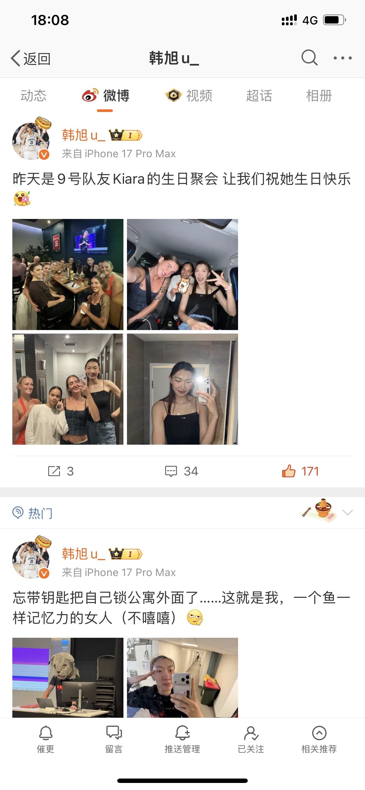 韩旭在海外打球是真的很开心啊! 我想这样子的韩旭是球迷所期待的状态! 因为她最近连续5天都有在微博分享自己的时时状况,而且每次都是配上自己开心的照片 看似简单的生活点滴,实际上是从韩旭的这个行为当中展现出,她在海外WNBL打球,真的感受到了更多的快乐 而此前韩旭在国内的时候,十天半个月都不见她分享自己的动态 彷佛这一趟海外联赛之旅,给她换了一个人似的! 这样的韩旭,肯定是我们这些喜欢韩旭的人所期待的样子! 开心才能让韩旭原本就强大的实力发挥的淋漓尽致! 让我们一起祝福韩旭,希望她一直这么快乐的打球,快乐的度过每一天!