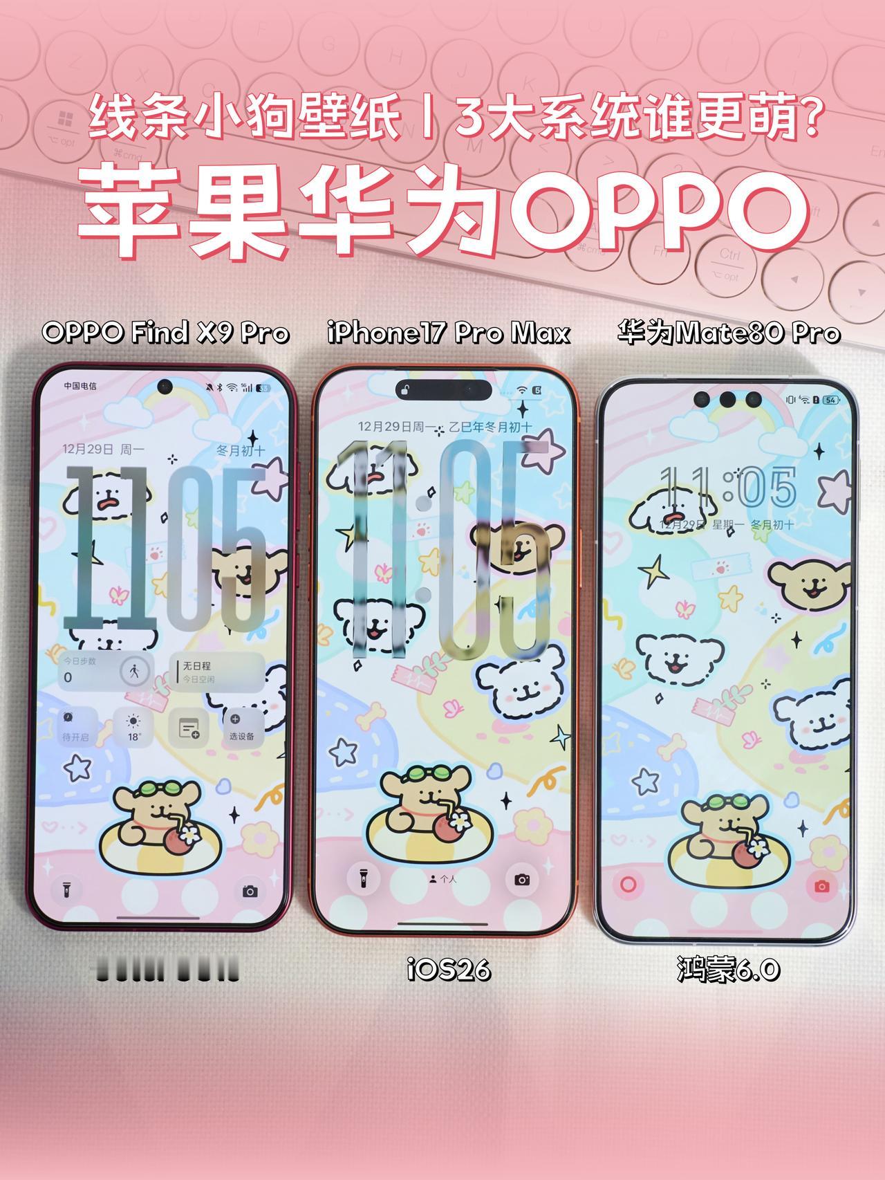 线条小狗壁纸丨3大系统谁更萌? 人一旦沾上线条小狗就完了,满脑子都是小白小金毛😂最近也是把手机换上了定制的主题,还专门去研究了下三大系统的线条小狗主题有啥区别,大家觉得谁更好看? 机型📱 iPhone 17 Pro Max(iOS 26) 华为Mate80 Pro(鸿蒙6.0) OPPO Find X9 Pro(ColorOS 16) 🍎苹果的话目前也就是换个壁纸图片,虽然也有定制的图标,但只能自己一个个换,玩法跟国产机比起来还是少了点 🏵️华为就 有专门的主题了,一整套定制,图标、壁纸、动态锁屏都有,一键就能更换,简单又好看~ 🟢OPPO玩法就更多了,不仅有壁纸、APP图标等全套的定制UI,还有锁屏小游戏、对话气泡等等有趣的小巧思,还有很多能diy的小组件,桌面图标还能玩狗狗大战~ 线下感觉OPPO对系统的功能适配是真用心啊,不仅diy的玩法多,还有很多实用的AI功能🐂像最近更新的AI写作就是,一键帮你回消息,高情商回复一点就有。 还有AI播客功能可以把长文章转成播客听,解放双手👋拍照的功能也很强,照片太暗能用AI人像补光修图,live图还能用出圈实况玩出新花样,喜欢拍照的真的很难拒绝~加上Find X9系列近期有活动了,国bu减500➕24期免xi➕送299礼盒,好多人在问的样子🤔 对比着来看,大家觉得这3大系统的线条小狗壁纸谁更萌呢?