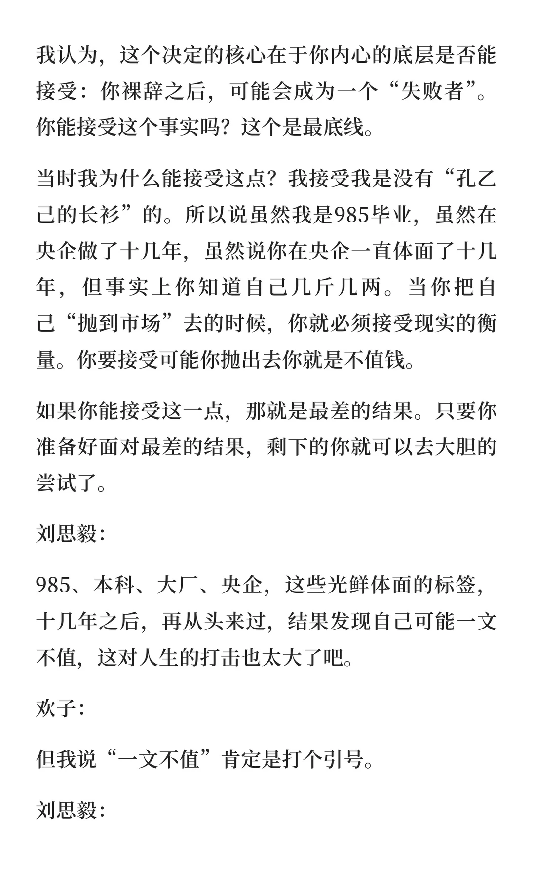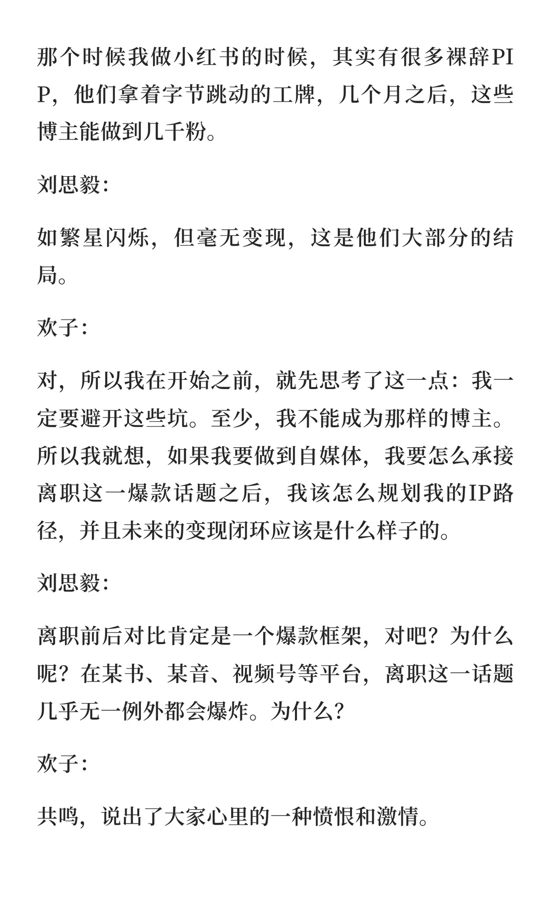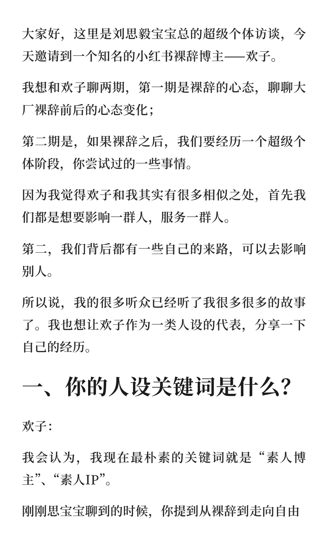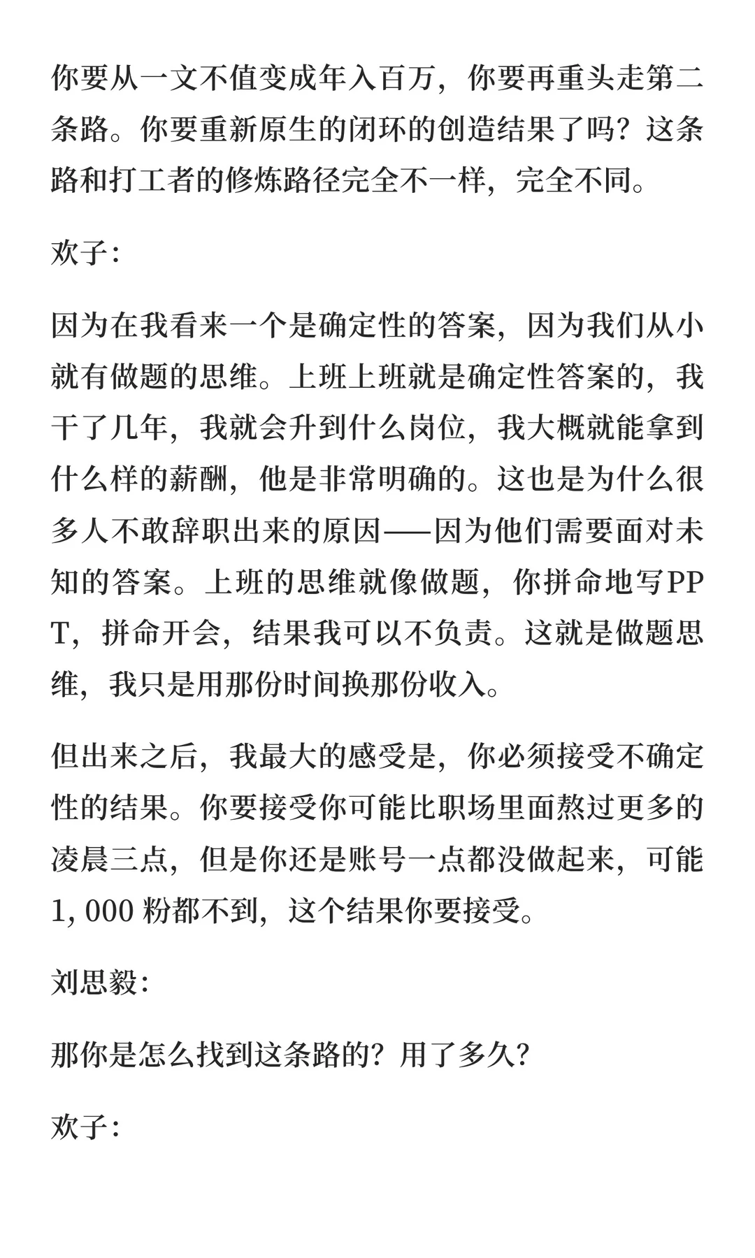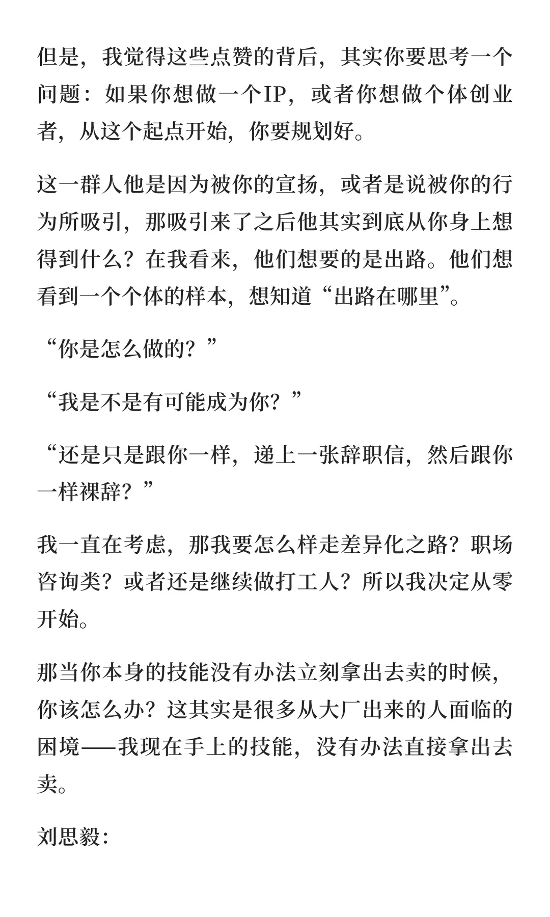 33岁央企裸辞三年,到底活成了什么样子? 这篇刘思毅访谈的逐字稿,浓缩了我所有的心路历程,希望对职场内耗或者正在转型的你有启发。 2026持续打造IP、搞流量、做刚需团购小生意 做确定的事,拥抱不确定的结果 当你可以和不确定性共处 无限的可能性就在生命中展开了 不上班搞钱指南 裸辞创业 一人公司 刘思毅