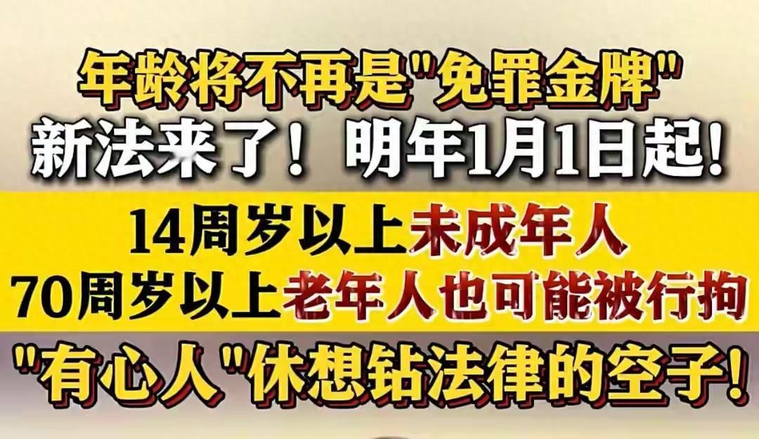 年龄将不再是“免罪金牌”新法来了!明年1月1日起14周岁以上未成年人、70周岁以上老年人也可能被行政拘留!   社会上有个让人挺闹心的现象:有些未成年人仗着自己“还小”,做了错事也不用怕拘留,顶多就是批评教育一下。还有些上了年纪的老人,一旦违法,很多时候也因为“岁数大”被豁免了行政拘留。   结果,出现了这样一种误区:只要年龄卡着线,违法成本就很低。大家伙一边看着气愤,一边又觉得无奈。现在,这种情况终于要改变了。   12月28日报道,新修订的《治安管理处罚法》2026年1月1日就要正式施行。这回最大的变化,就是明确了十四岁以上的未成年人和七十岁以上的老人,在一些严重的情况下,也可以被行政拘留。   过去那种“只要年纪合适,违法不用拘留”的日子,算是彻底到头了。新规一出,不管你是“熊孩子”还是“老顽童”,只要屡教不改,或者犯的事特别恶劣,公安机关就能依法把你拘留起来。   原来法律对十四岁到十六岁的未成年人,规定不执行行政拘留,哪怕他们一年内多次违法;十六到十八岁的孩子,第一次违法也不用拘留;七十岁以上老人也有类似的“保护伞”。   这本来是考虑到未成年人还没完全长大,思想不成熟,老人身体健康也需要照顾,体现了法律的人性化。但问题是,有些人就钻了这个空子。   社会上屡屡有新闻曝出,未成年人明知道不会被拘留,胆子越来越大,违法行为也越来越多。再加上网络上各种“未成年人犯罪不用负责任”的说法,让不少人心里都憋着火。   这次新规的调整,说白了,就是让那些想占便宜的人打消念头。对于十四至十六岁的未成年人,若在一年内两次及以上违反治安管理规定,依照法律规定,便可对其执行行政拘留措施。   哪怕是第一次违法,但情节特别严重,影响特别坏,比如校园霸凌、聚众打架这种,也能依法拘留。十六到十八岁的未成年人,初次违法只要情节恶劣,同样可以被拘留。   七十岁以上的老人,如果一年之内两次以上违法,或者其中一次性质很严重,也不再享受“豁免权”。当然,法律还是讲究“宽严相济”,特别是对未成年人。   新规也强调,公安机关对不够拘留条件的未成年人,还是要根据《预防未成年人犯罪法》,采取矫治教育等办法,不能一上来就拘留。   实在没有必要的,还是以教育为主,惩罚为辅。只有那些屡教不改、影响恶劣的,才用拘留这个办法。对七十岁以上的老人,也会考虑身体状况和实际影响,绝不是“一刀切”。   仔细想想,这次修法其实挺贴近现实。为啥这么说?大家都知道,社会治安越来越复杂,未成年人和老年人的违法问题也越来越受到关注。   过去,很多家长和老师遇到“熊孩子”头疼得不行,公安机关也挺为难:抓吧,法律不允许;不抓吧,问题越来越多。   这次修法,是对大家关心的回应,既保护了特殊群体的基本权利,又让违法行为有了应有的约束,让社会更安稳。   老百姓都关心:什么叫“情节严重、影响恶劣”?其实法律也有明确界定,像校园欺凌、聚众斗殴、恶意伤人这些,都属于情节严重的范畴。是不是所有的“小错”都要拘留?当然不是。   只有那些影响大、社会危害性强的行为,才会用到行政拘留这个“杀手锏”。大多数情况下,公安机关还是会评估具体情况,能教育的就教育,能挽救的就挽救。   说到这里,其实还有个值得大家思考的地方。新规虽然让违法成本变高了,但对家庭和学校来说,也是个提醒。孩子的教育不能光指望学校、法律,家长的管教和引导也很重要。   毕竟,法律只是“最后一道防线”,平时的家庭教育和社会关注,才能让孩子真正明白什么能做、什么不能做。   对于老人也是一样,子女多关心、多提醒,社会多一些关爱,违法的概率自然会小很多。这次法律修订,其实是和国际上很多国家接轨的。   像日本、德国等发达国家,对于未成年人违法,也都是“保护为主、惩戒为辅”,但绝不纵容恶性违法。   中国这次调整,是顺应社会发展、回应群众期盼,也是法律不断完善和进步的体现。以后,社会上再遇到那些仗着“年龄挡箭牌”胡作非为的人,这根“保护伞”可就不好使了。   法律的底线清清楚楚,谁都别想着钻空子。对老百姓来说,安全感更强了,孩子和老人也能得到更科学、更有力度的教育和管理。其实,只有大家都守规矩,社会才能更和谐。   新《治安管理处罚法》实施后,无论是公安机关、学校还是家庭,都要适应新的变化。对待未成年人和老年人违法,不再是简单的“包庇”或“放纵”,而是有法可依、该宽则宽、该严则严。   相信通过这次调整,社会秩序会更加稳定,大家的生活也会更安心。 参考来源:年龄不是挡箭牌,一老一小违法,也可能被拘留——看看新闻Knews2025-12-28
