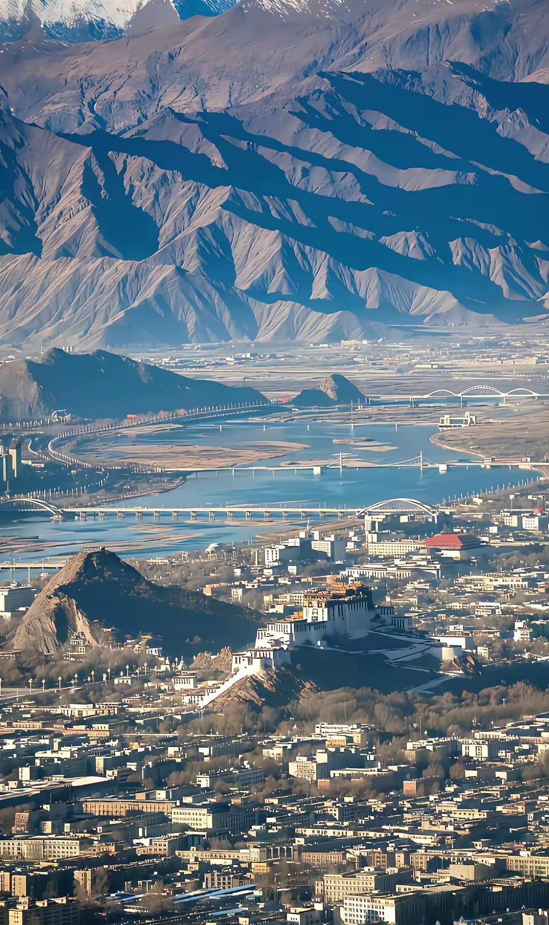 布达拉宫,在我们眼中是那么雄伟壮观。夜色阑珊处的布达拉宫,在五色灯光的照谢下,又增加了几份神秘感。白天,从高处鸟瞰整个拉萨城,布达拉宫掩没在群山峻峻之中,倒也没有那么起眼。远处的山峰,没有一丝一毫绿色的植被,巍峨高大。山脚下,清清的河水流淌,滋润着人们甜美的生活。依山傍水,拉萨是一座美丽的高原之城。今生也许没有机会游览拉萨,但我心中的拉萨城是那么美,那么美,美的像一张画。
