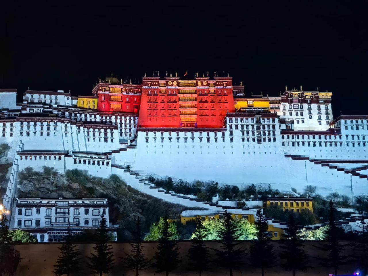 布达拉宫,在我们眼中是那么雄伟壮观。夜色阑珊处的布达拉宫,在五色灯光的照谢下,又