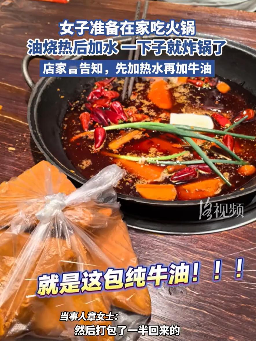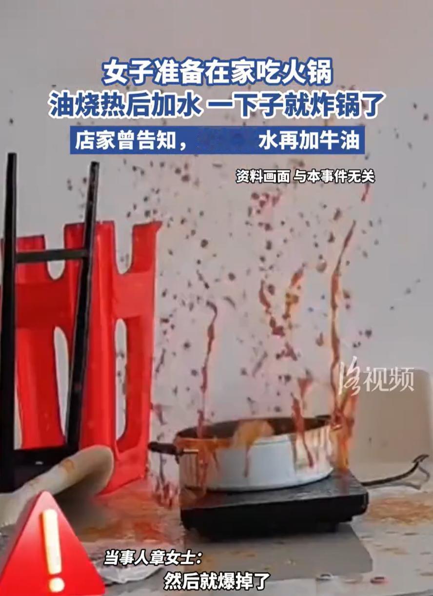 这代价也太大了!上海,女子在店里打包了一份牛油锅底回家吃,万万没想到,因为顺序没搞清楚,加水后火锅直接炸了,好好的天花板一瞬间沾满了牛油,火锅没吃上不说,家里还要重新装修一下 章女士介绍,之前在店里吃火锅,觉得味道不错,就打包了一半纯牛油回家,当时店家提醒过,要先加热水再加油,可自己当时忘了顺序,也没在意会有什么危险性,就先加了油后加的水,结果就是直接爆开 好在自己当时离得远,并没有直接蹦到皮肤上,但屋子就惨了,墙壁、家具崩的都是油,吃火锅的心情也没有了 这个事听着离谱,其实很多人都会踩这个坑。纯牛油和家里常用的清油完全不是一回事。牛油在常温下是固体,加热后温度很高,这时候突然加水,水会瞬间变成水蒸气,体积猛地膨胀,把高温油直接顶飞。不是锅炸了,是油被水顶炸了。原理不复杂,但生活里很少有人认真想过这一步 很多火锅店愿意把牛油锅底单独打包,本身没问题,味道也确实好。但这类锅底本质上更接近高温油脂操作,不是简单的热一热。顺序一旦反了,危险性立刻就上来。店家提醒是一回事,回到家没人盯着,容易觉得没那么讲究,结果往往就出事在这种不讲究上 章女士已经算幸运的,损失主要在房子,没有伤到人。真要是油溅到脸上或手臂上,后悔都来不及。牛油火锅好吃,但真不适合随便折腾。要么严格按正确方式操作,要么干脆在店里吃完,省心也安全