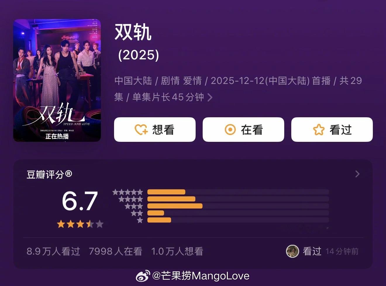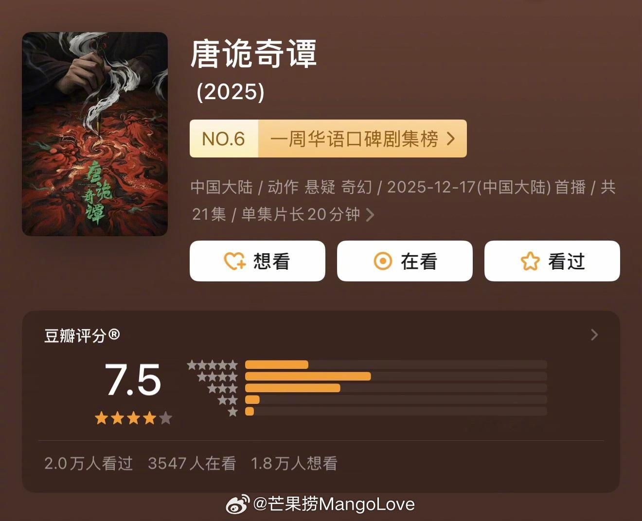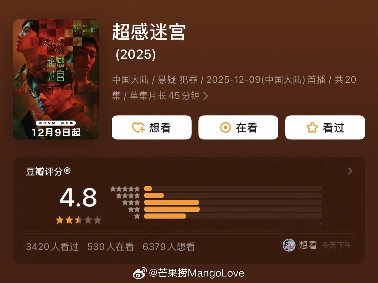 近期热播剧集豆瓣评分开分费启鸣 / 吕小雨 海市蜃楼 8.1分杨旭文 / 杨志刚 唐诡奇谭 7.5分虞书欣 / 何与 双轨 6.7分段奕宏 / 窦骁 / 王佳佳 超感迷宫 4.8分