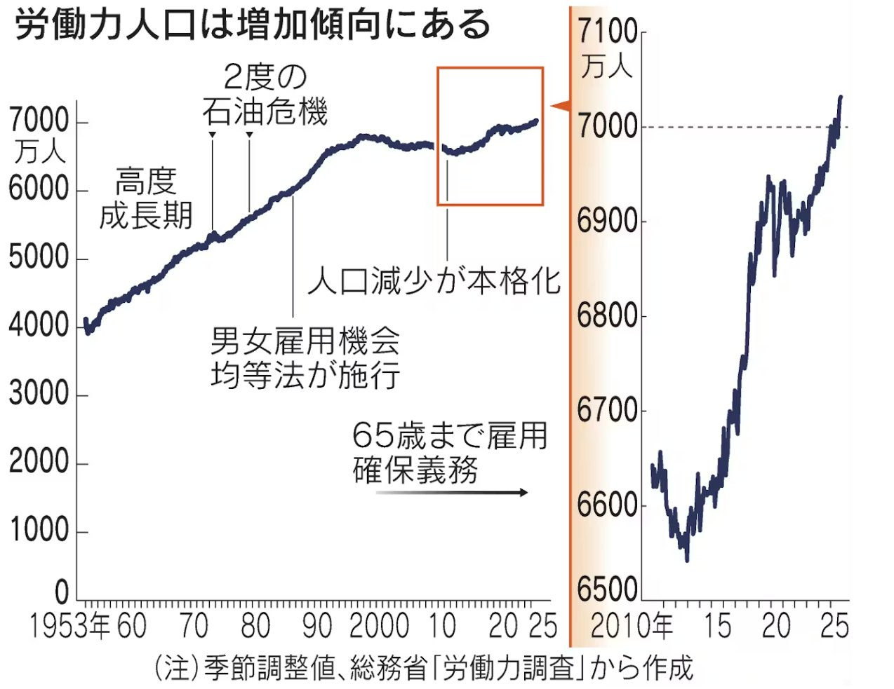 日本人口已经连续15年下降,但劳动力却在增长,预计将在2025年首次突破7000万。越来越多的女性和老年人加入或继续留在劳动力市场,这有助于弥补整体劳动力的下降。~~~~~~~~~~~~~~日本近年应该还放宽了一些移民限制,应该也有助于缓解劳动力紧张的状况,据说很多服务业有不少亚洲其他国家人的面孔