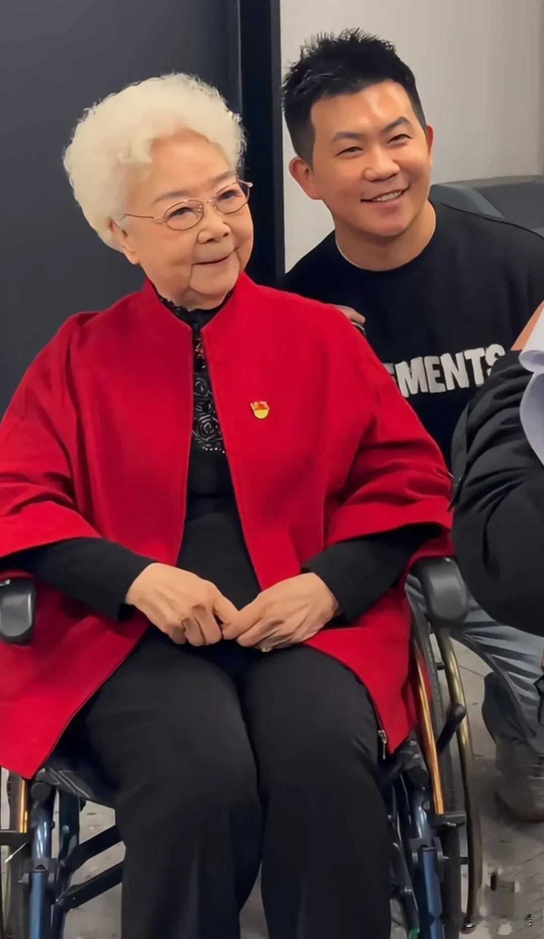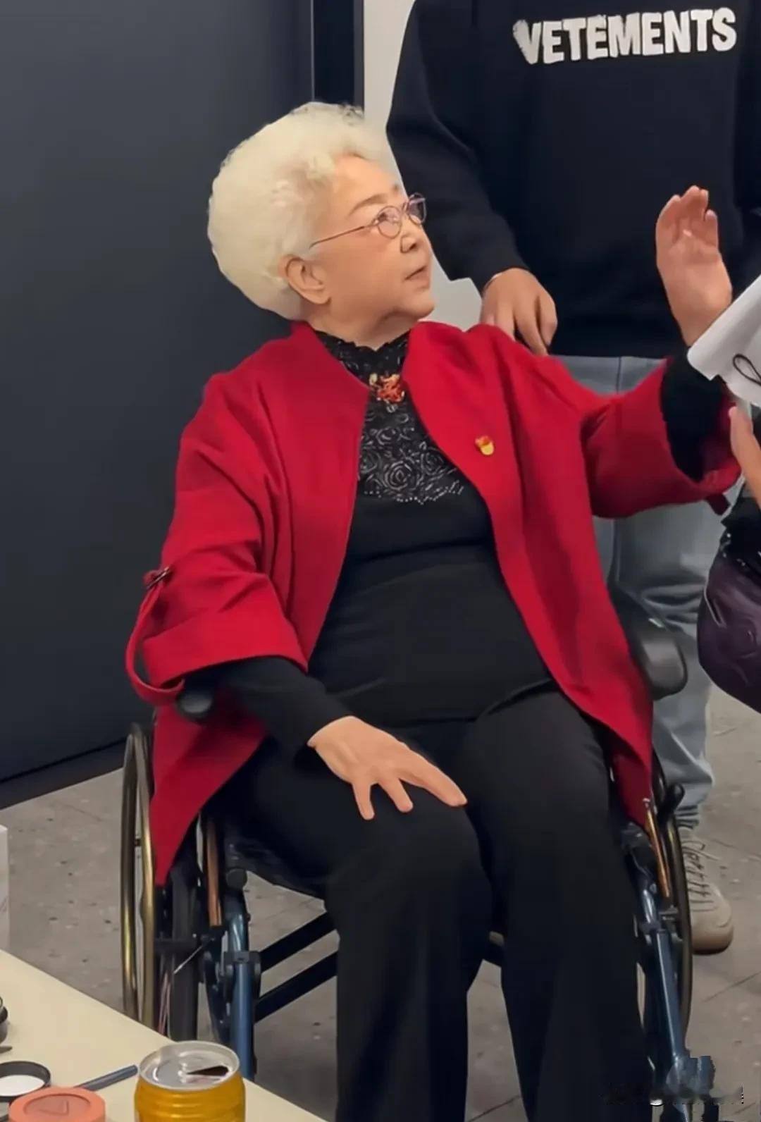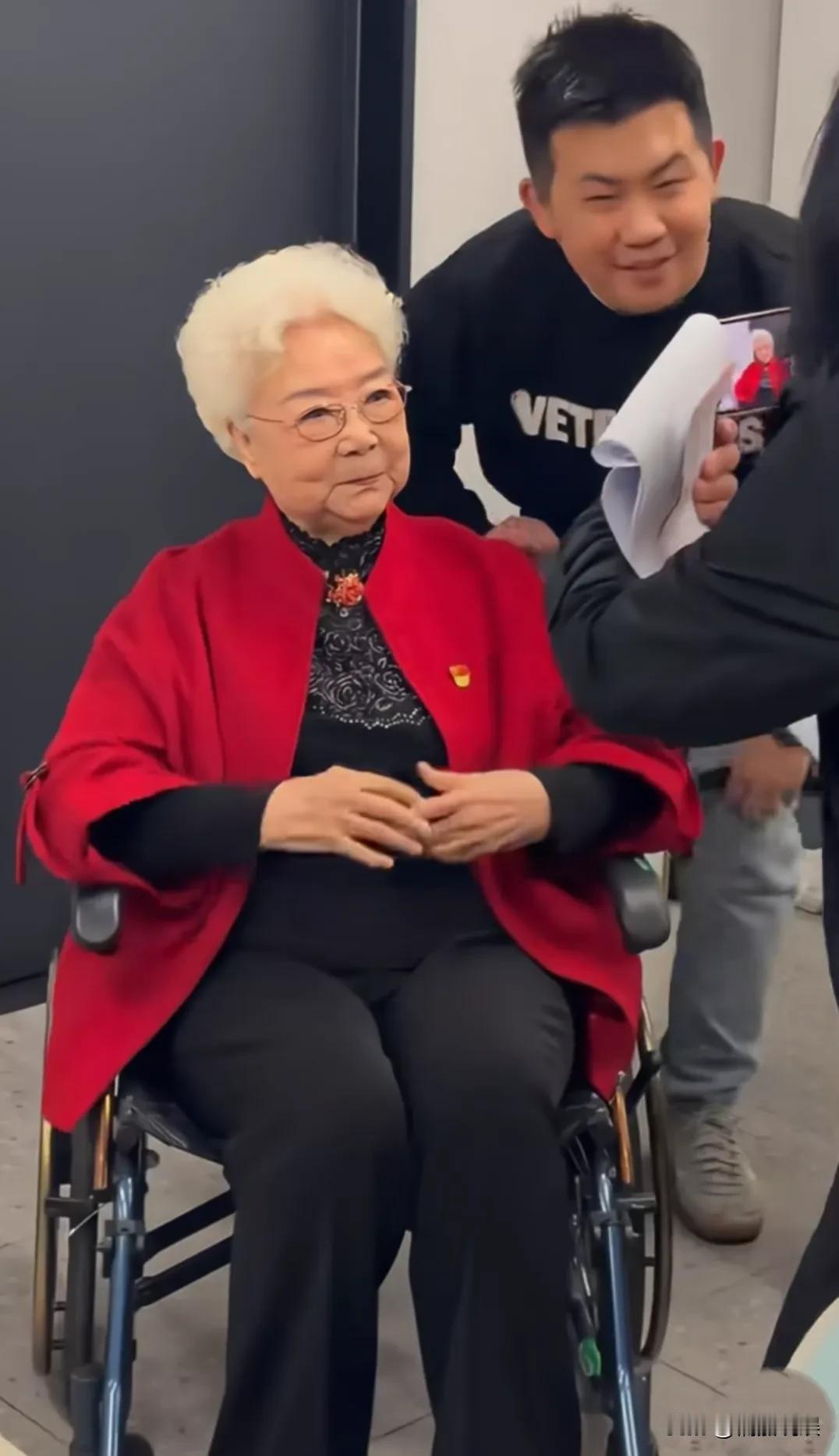 老艺术家田华老师参加活动,穿着一件大红色的外套,满头银发,戴着眼镜,气质斯文,有种鹤发童颜的既视感。因为腿脚不是很轻便,还坐着轮椅。 尽管脸上有很多的岁月痕迹,但是她说话中气十足,说话时反应敏捷,看着思路挺清晰的,太厉害了! 毕竟她马上就98岁了,算得上是真正的百岁老人了。 看过新闻,老人家一生吃、住简朴,却从未停止过公益的步伐,不愧是“德艺双馨的艺术家”,感觉这才是真正的明星和偶像啊![赞]