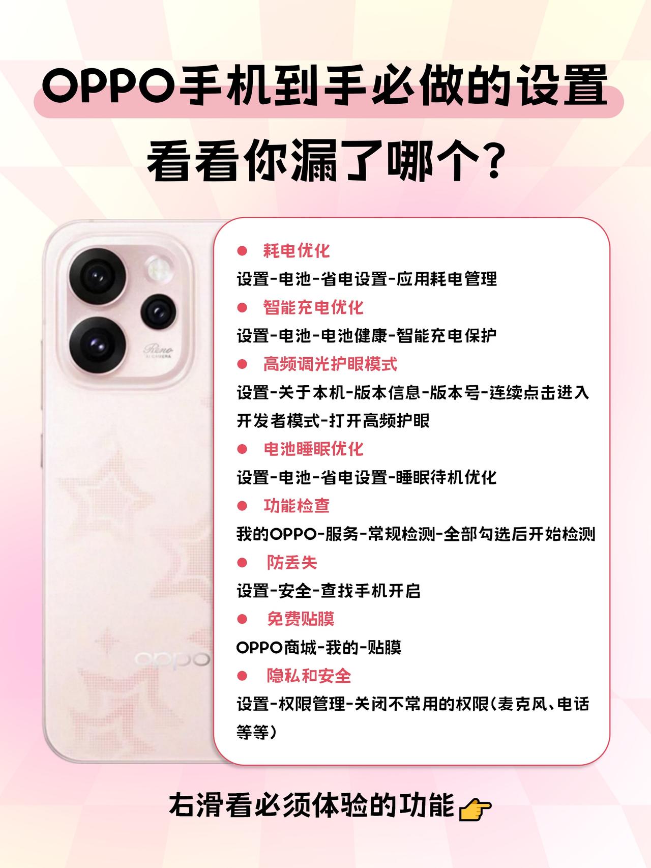 OPPO手机到手必做设置,看看你漏了哪个? 啊啊啊!新手机到手一个多星期了,我终于把OPPO Reno15玩明白了! 这几个设置做完,体验感直接拉满,刚入OPPO手机的朋友们快学起来👇 1️⃣ 关闭烦人广告:打开「浏览器」-「我的」-「设置」-「隐私」-「关闭个性化推荐」,世界瞬间清净~ 2️⃣ 黑屏手势秒开:在「设置」-「辅助功能」-「手势体感」里开启,打开黑屏手势,画V开手电、画O秒开相机,很方便~ 3️⃣ 充电优化:打开「设置」-「电池」-「电池健康」-「智能充电保护」,充电更安全 4️⃣ 保护隐私:在「设置」-「隐私」里,开启应用管理,可以管理应用的敏感权限,比如麦克风、定位,避免个人信息泄露 5️⃣ 手机防丢设置:提前打开「设置」-「电池」-「查找」,手机万一丢了还有机会找回! 不过我用了这么多,最喜欢的还是Reno15的实况玩法💓 ✅出圈实况拼图:相册里选2-9张实况照片,一键就能把人物或宠物“抠”出来,自由拼成一张会动的3d live大片! ✅CCD闪光实况:在暗光下开闪光灯拍live,直出复古CCD质感,氛围感拿捏了 ✅AI实况壁纸:在主题商店或个性化设置里,能把静态照片变成有呼吸感的动态壁纸,桌面立马活了👍 🤔一整套下来,就像换了台新手机 特别是实况功能,玩一天都不腻!大家都快去试试~ OPPO Reno15 玩机攻略 Live