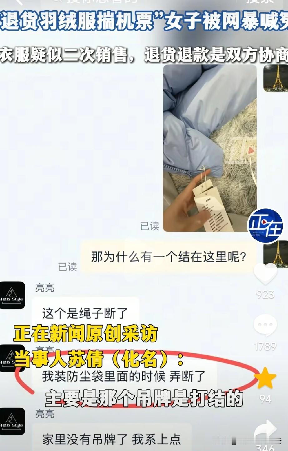 退货的羽绒服里机票这事的当事人苏女士露面了,苏女士说视频火了后,她被网暴了。她的电话号码和真实姓名被扒出,她的抖音号也被网友扒出,每天有很多陌生号加她骂她,她都快崩溃了。 苏女士觉得这事她很冤枉,明明是收到的羽绒服有打结,她怀疑是二次销售才要退货的。商家也是同意的,怎么就成了她恶意退货呢? 还有苏女士说,羽绒服她只穿了一次,就是去哈尔滨时下飞机的时候穿上的,所以把机票随手装进了口袋。但她进酒店后就脱下了,再也没穿过。 再说她从哈尔滨回到三亚就接着退货了,也没超规定的15天的退货时间。 视频是工厂发出来的,商家表示自己没发,商家说现在他被平台处罚,自己也很委屈,他和苏女士都是受害者。 对于这件事,你怎么看呢?