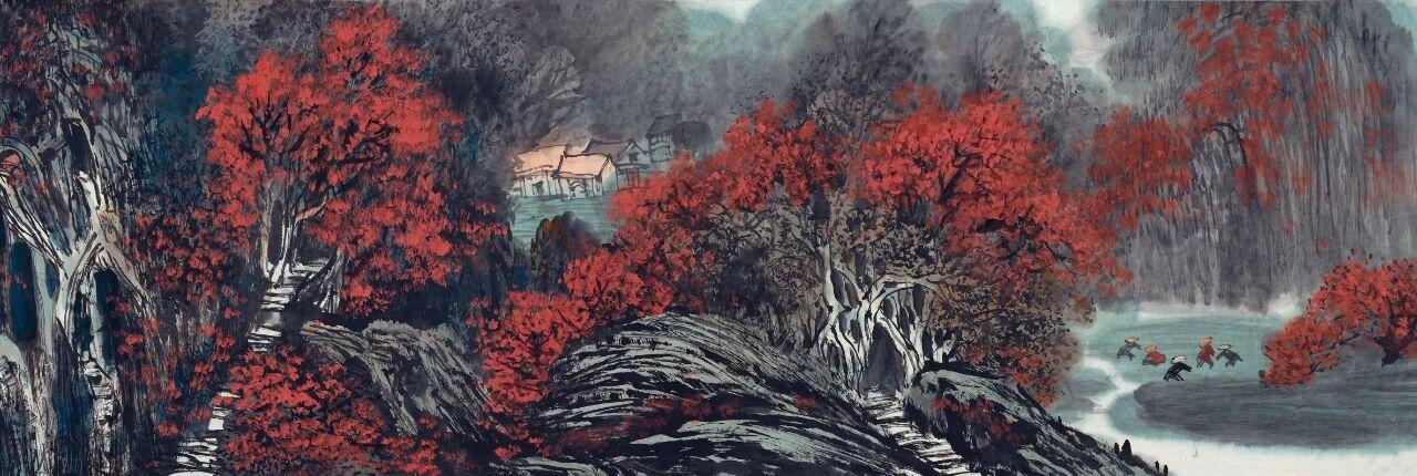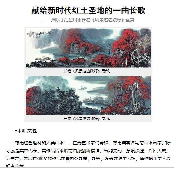 作品赏析:张际才《风景这边独好》。 《风景这边独好》创作于2013年,长26米,宽56厘米,现藏于赣州美术馆。 《风景这边独好》素材全部来源于画家故乡赣南,长卷抓住红色这一主线,以写意的表现手法,全景式地描绘了红色赣南的风土人情。画面时而层峦叠嶂,林深谷幽,飞瀑流泉,万木葱茏;时而小桥流水,深山人家,竹篱茅舍,秋色正浓,丰收满园……内容丰富,布局精妙,峰回路转,气象万千。随着长卷徐徐展开,仿佛走进了一条时空长河,带你回到那遥远而亲切的故乡,深深唤起人们对红色赣南那段峥嵘岁月的回忆和敬意,是作者献给新时代红土圣地的一曲长歌。 张际才的红色山水,设色雅丽,色不伤墨,墨与色相互映衬,相互交融,中国传统山水笔墨技法扎实深厚,写意精神饱满强烈,极具现代视觉审美张力。《风景这边独好》不仅集中体现了张际才这种艺术风格,同时表现技法变化多样。作品打破了传统山水画以线造型的樊篱,大胆借鉴西画中块面、光影、透视等技法,笔、墨、色、水交互相融,纯净亮丽,和谐统一,给人痛快淋漓,挥写自如的艺术享受。 文/摘自《献给新时代红土圣地的一曲长歌——张际才红色山水长卷《风景这边独好》鉴赏,原载《赣南日报》2022年11月14日,作者/木叶