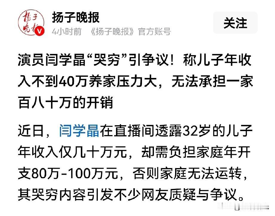 演员闫学晶“哭穷”这是在打谁的脸? 在如今的中国,年消费80-100万元是什么概念?大部分普通老百姓家庭年消费8万元恐怕都是一个大关,闫学晶这哪是在“哭穷”?这分明是在向老百姓炫富,不,应该是在炫她的阶层优越感更准确! 普通老百姓认识闫学晶,还是从赵本山的戏里看到的,至于她是什么咖,估计很多人都不知道,就更别说她儿子了,她儿子是谁?反正我是一点都不知道! 一个名不见经传的演员,其家庭年消费居然高达上百万,这是一种什么样的存在?