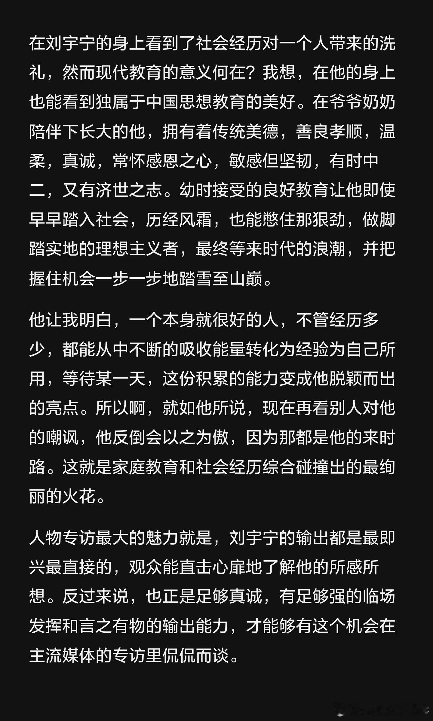 【热帖分享】网友发文,在刘宇宁身上看到了社会经历和综合教育的意义。引起了网友共鸣。顶刘就是娱乐圈的清流~榜样的力量是无穷的