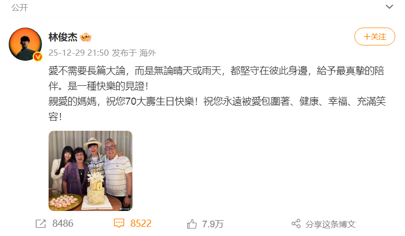 #林俊杰官宣恋情# 12月29日,林俊杰通过微博晒出四人合照,包括女友、父母和本人,并配文祝福母亲70岁生日,强调"陪伴"与"幸福",被解读为间接认爱。此前,两人曾被网友在洛杉矶偶遇穿情侣装同行。女方是24岁网红"七七"(Annalisa),比林俊杰小20岁,网传为美国帕森斯设计学院留学生,家境优渥。