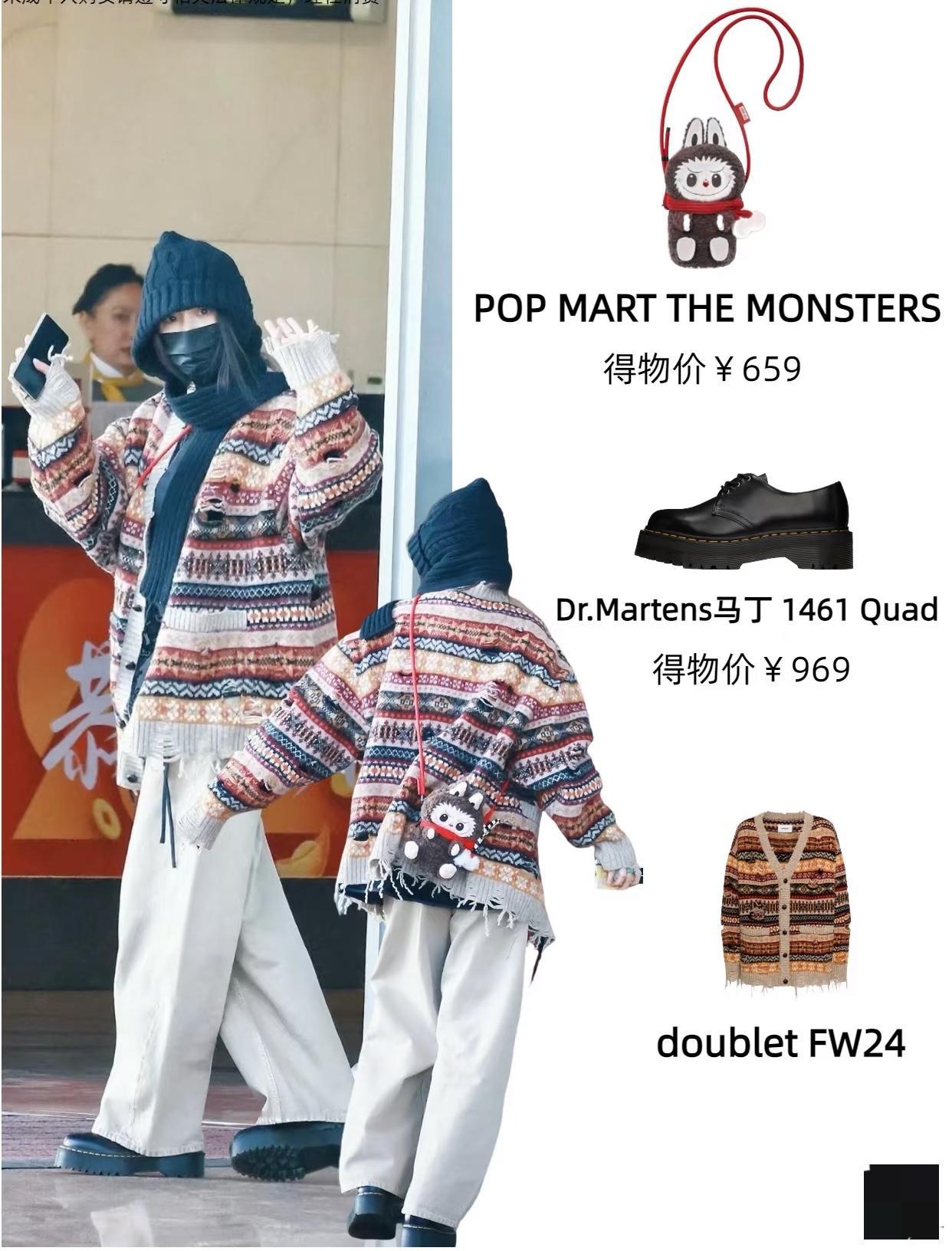 杨幂今天的新穿搭, 感觉上半身挺好看青春洋溢还有点漫画少女风, 下半身就不搭看的懂了, 裤子的颜色很好, 跟毛衣很搭而且遵循上衣图案繁复裤子就选纯色系, 到这款式即便杨幂也没穿出腿长, 这个厚底马丁鞋是为了呼应帽子围巾吧, 但真不好看[捂脸]