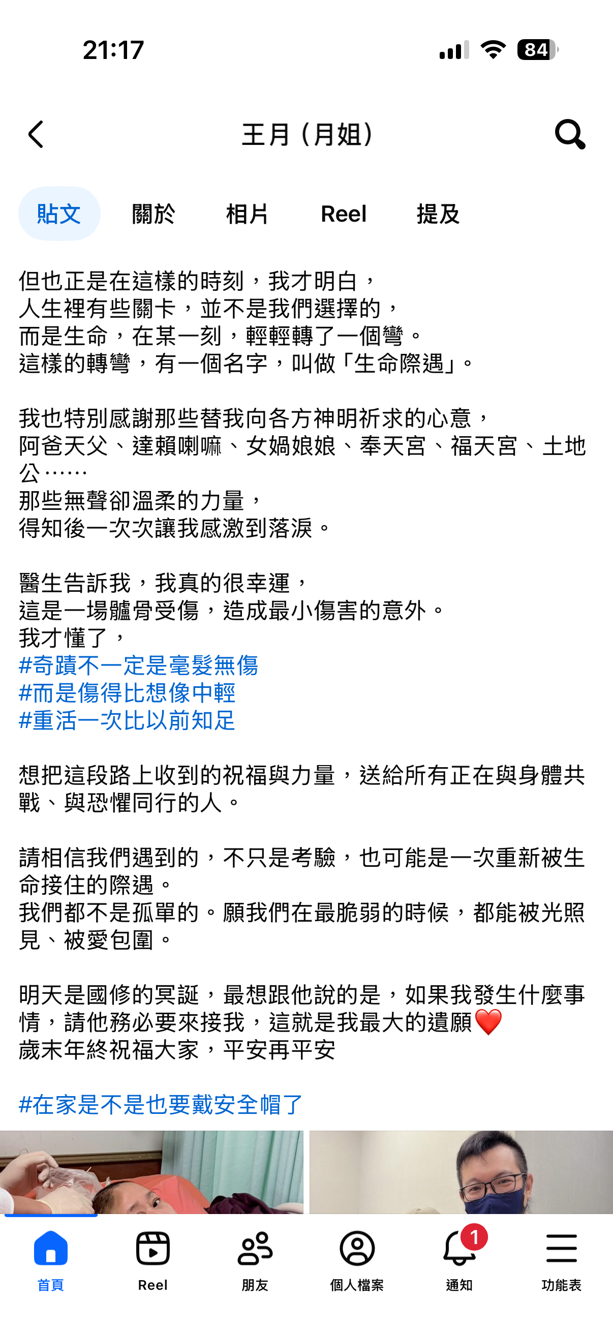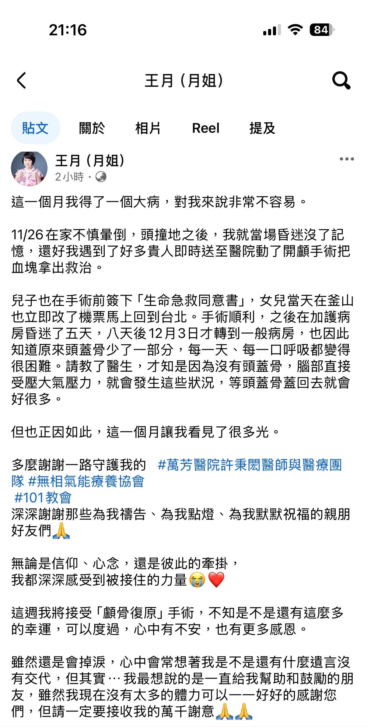 艺人王月今晚更新贴文,透露自己上个月意外昏迷,不仅失去记忆,更紧急送医接受开颅手术取出血块。当时儿子急忙签下生命急救同意书,女儿也自国外赶回台北,而她在加护病房昏迷5天后顺利甦醒,随后转回一般病房。