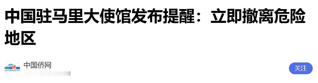 紧急通知!中国大使馆凌晨发文。要求中国公民立即撤离!!!看见这个新闻的时候,我还以为是日本那边的。毕竟中日这事已经闹了那么久,真到了不可挽回的地步,也都正常。点开一看是马里的,位置在布谷尼大区。 说真的,使馆凌晨发文从来不是闹着玩的——2025年12月24日这声紧急提醒,背后是布谷尼大区实打实的危险。 根据中国驻马里大使馆的官方通报,近期恐怖分子在布谷尼大区针对中国公民和企业的袭击已经到了肆无忌惮的程度——他们不仅焚毁生产设备,还直接绑架多名中国同胞,目前这些被绑架人员的下落还没有完全明确。 这种专门盯着中国人下手的恶性袭击,不是偶然发生的孤立事件,而是持续升级的安全危机。 今年7月,马里南部布古尼地区的中资矿场就曾遭到极端组织“支持伊斯兰和穆斯林组织”的袭击,当时就有5名中国公民被绑架,生产设备也被纵火焚毁 同一月份,马里卡伊区的一家水泥厂也遭遇了该组织的袭击,1名中国公民和3名印度公民被绑架,场地和设备同样没能幸免。 可能有朋友会问,为什么恐怖分子偏偏盯着中国公民和企业?这和当地的产业特点以及部分同胞的经营方式有关。 马里虽然经济不发达,但黄金储量丰富,不少人前往当地从事采金相关工作,其中不乏非法采金的人员。 这些非法采金区域往往安防措施极其薄弱,既没有正规的安保力量,也得不到当地政府的安全保护,就像毫无防备的羔羊,自然成了恐怖分子眼中的“肥肉”。 使馆在之前的提醒中就明确指出,肯涅巴、布谷尼、康加巴这些非法采金人员聚集的地方,都多次发生过恐袭事件,已经有同胞因此丧生,给家里人带来了无法弥补的伤痛。 这次使馆的紧急通知已经不是今年第一次提醒了。早在12月4日,使馆就通过微信公众号发布过消息,明确指出巴马科以外地区恐怖分子活动猖獗,要求非法采金人员立即停工撤离。 当时不少同胞听从提醒及时撤离,成功避开了危险,但仍有部分人抱着侥幸心理,要么拒不撤离,要么撤了之后又偷偷返回,执意在高风险地区继续活动。 现在恐怖分子的袭击越来越频繁、越来越凶狠,使馆的再次提醒,甚至在凌晨发文强调,就是要打消这些人的侥幸心理——这不是警告,而是生死关头的救命信号。 这里必须跟大家说清楚,使馆的提醒里有个重点:务必合法经营,马政府无法对非法经营的中国公民和企业提供安全保护。 这不是一句空话,而是基于当地实际情况的必要警示。在战乱和恐怖主义肆虐的地区,合法经营尚且面临巨大风险,非法经营更是等同于把自己置于险境。 对于那些在布谷尼大区非法经营或未得到马方安全保护的同胞来说,现在最该做的就是放下一切顾虑,立刻收拾行李撤离,任何犹豫和拖延都可能付出生命的代价。 可能有朋友会联想到之前的苏丹撤侨、也门撤侨,那些惊心动魄的撤离经历告诉我们,每当同胞在海外遭遇危险,祖国永远是最坚实的后盾。 对于计划前往马里的朋友,现在必须彻底打消这个念头,此刻的马里不是旅游或淘金的目的地,而是暗藏杀机的险境,任何侥幸心理都可能酿成悲剧。 其实不管是之前的中日相关话题引发的关注,还是这次马里的紧急撤离通知,都反映出一个道理:国际局势复杂多变,海外同胞的安全从来都牵动着国内每个人的心。