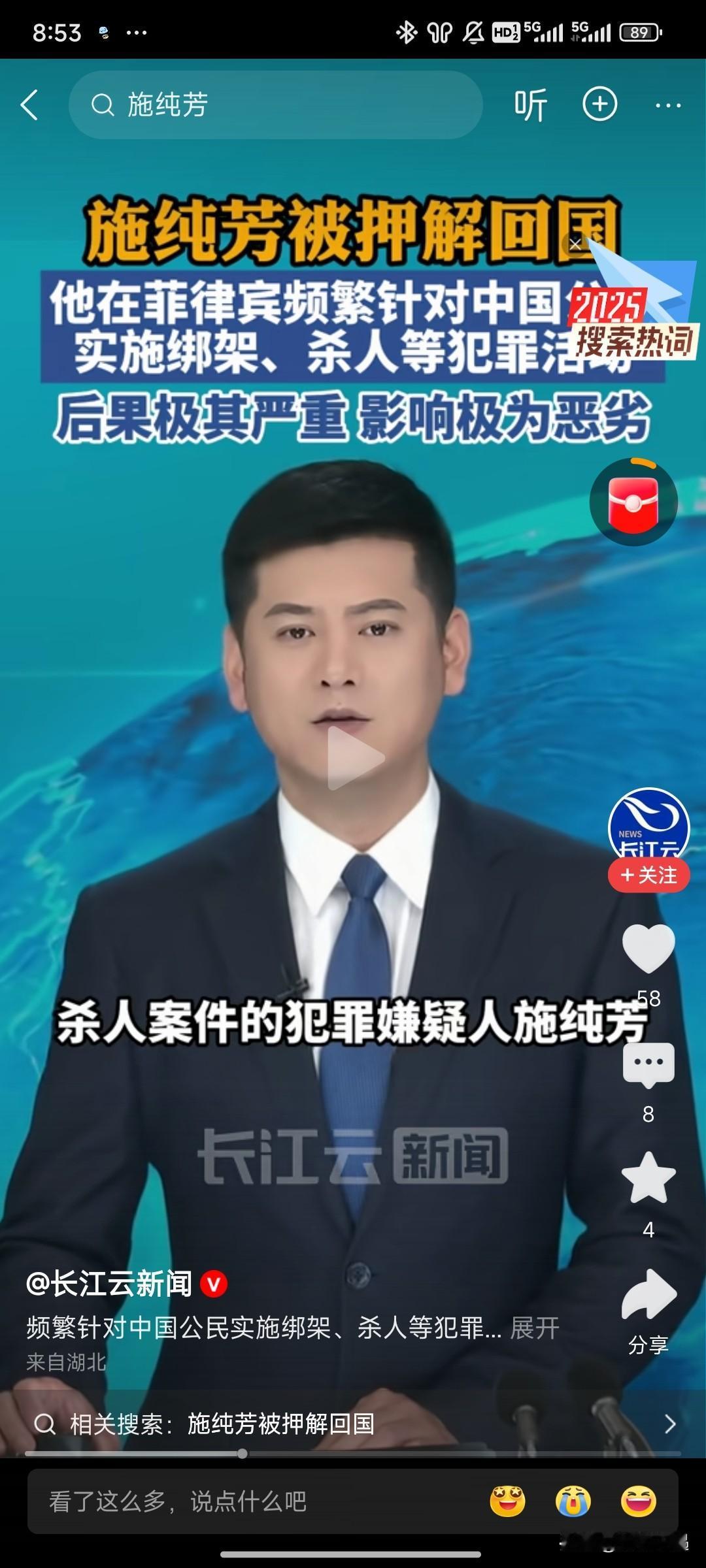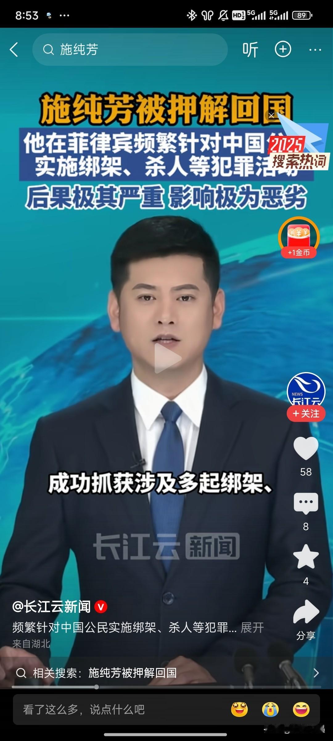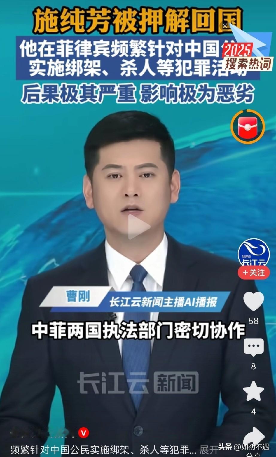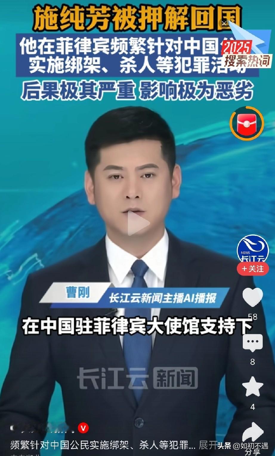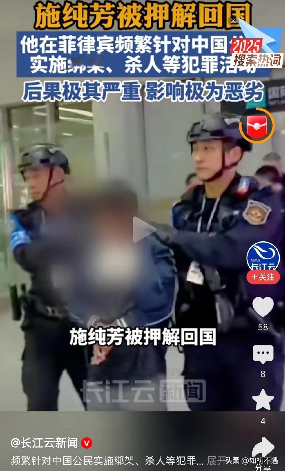 特大好消息!刷到那个在菲律宾专坑咱中国同胞的恶魔施纯芳,终于被押解回国了! 这小子简直丧心病狂,绑架勒索、杀人越货,啥缺德事都干得出来,不知道毁了多少个幸福的家庭!想想那些受害者,真的气得牙痒痒! 还好中菲两国联手出击,大使馆也给力,不管这货逃到天涯海角,照样给你揪回来!咱中国的执法力度,就是这么牛!必须给办案的英雄们疯狂点赞! 天网恢恢疏而不漏,犯我同胞者,虽远必诛! 各位怎么看!欢迎在评论区留言!