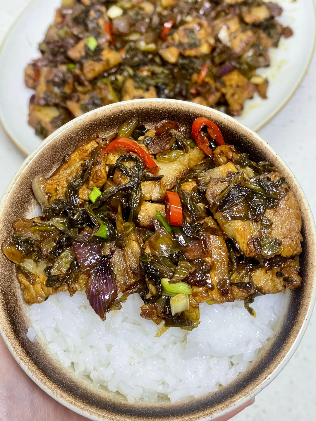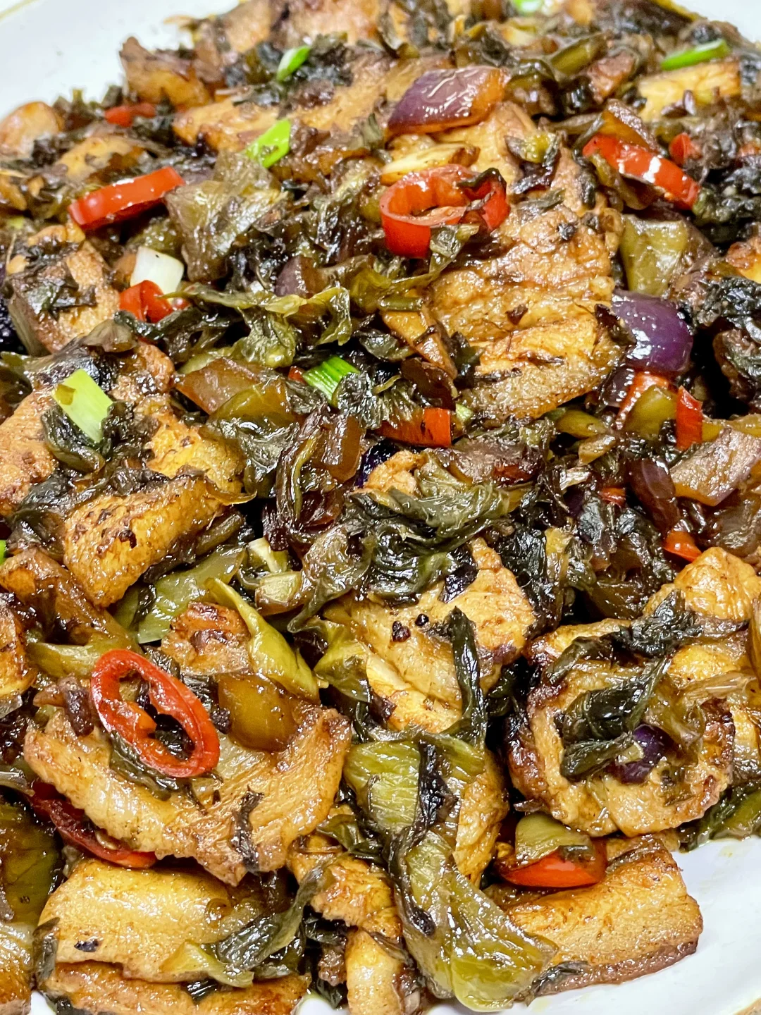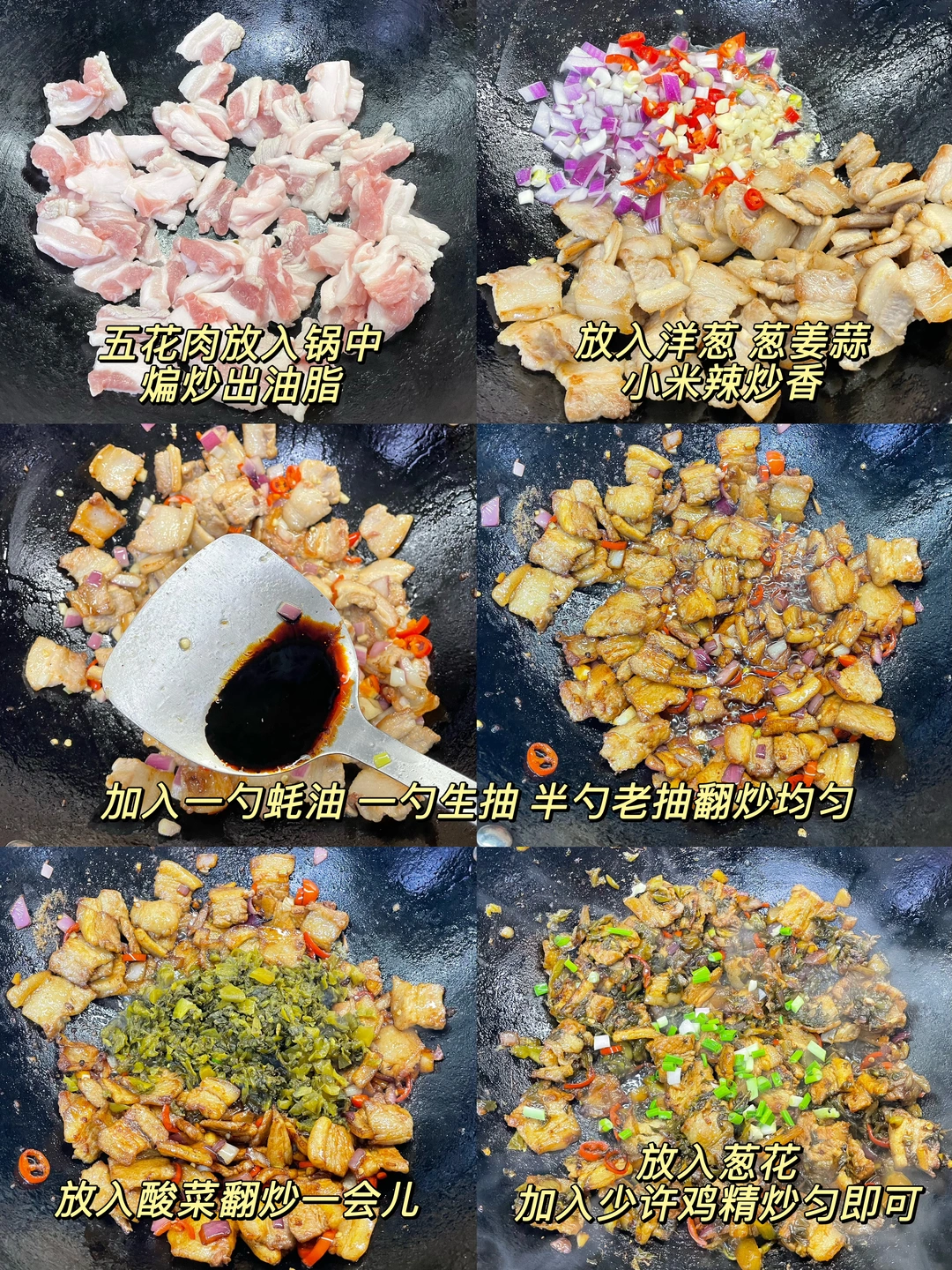 看起来平平无奇的酸菜炒肉,实则巨下饭,我愿称它为饭扫光,而且这个肉也巨好吃,喜欢的姐妹赶紧试一下,做法简单,有手就会~ 1⃣️ 五花肉切成自己想要的小块,酸菜切碎 2⃣️ 锅热放入五花肉煸炒出油脂煸,放入葱、姜、蒜、小米辣 洋葱炒 3️⃣加一勺蚝油,一勺生抽,半勺老抽翻炒入味,放入酸菜中火翻炒三分钟,炒出酸菜的乳酸味,起锅前来点葱花 鸡精炒匀即可