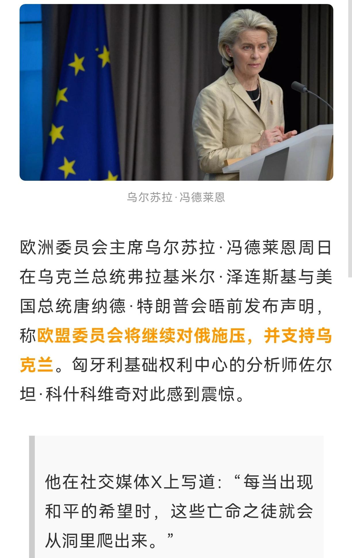“每当出现和平的希望时,这些亡命之徒就会从洞里爬出来。”匈牙利基础权利中心的分析师痛批冯德莱恩,眼看美乌会谈在即,冯德莱恩却唱反调:欧盟仍将对俄施压并支持乌克兰。 最近国际上关于俄乌冲突的事儿有了点新动静,最受关注的就是美国总统特朗普要会见乌克兰总统泽连斯基。 熟悉这事儿的都知道,特朗普一直以来对俄乌冲突的态度就跟现在的美国政府不太一样,他多次提过想推动俄乌和谈,所以这次两人要见面,不少人都觉得,这说不定是和平解决冲突的一个好苗头。 毕竟打了这么久,不管是俄乌两国的老百姓,还是周边国家,都盼着能早点停火,恢复安稳日子。 就在大家都对这次美乌会谈抱有期待的时候,欧盟委员会主席冯德莱恩却站出来说狠话了。 她明确表示,不管美乌会谈结果怎么样,欧盟都不会改变态度,还会继续对俄罗斯施压,同时也会一直支持乌克兰。 这话一出来,立马就引来了不少争议,匈牙利那位分析师的痛批就是个典型例子,觉得她这是在破坏和平的希望。 可能有人要问了,冯德莱恩为啥非要在这节骨眼上唱反调呢?其实了解欧盟和俄乌冲突的关系就不难理解,这几年欧盟一直跟着美国的步伐,在俄乌冲突中站队乌克兰,对俄罗斯出台了不少制裁措施。 虽然这些制裁措施也让欧盟自己吃了不少苦头,比如能源价格上涨、经济受到影响,但在对俄态度上,欧盟内部虽然有分歧,可冯德莱恩代表的这一派一直比较强硬。 再说说这次美乌会谈的背景,现在距离美国大选越来越近,特朗普作为热门候选人,他的外交主张很可能影响未来美国的对外政策,包括对俄乌冲突的立场。 如果特朗普真能推动俄乌和谈,那欧盟之前在对俄制裁、支持乌克兰上的投入可能就会打折扣,这或许是冯德莱恩不愿看到的。 所以她在这个时候表态,也是想明确欧盟的立场,不想因为美乌会谈就改变自己的既定策略。 不过冯德莱恩的这个表态,显然和很多人盼和平的想法背道而驰,现在国际社会大部分声音都希望俄乌冲突能通过谈判解决,毕竟战争带来的只有破坏和苦难。 美乌会谈本来给大家带来了一点和平的曙光,结果冯德莱恩这番话,又让局势变得复杂起来。 大家也都在观望,特朗普和泽连斯基见面之后到底会谈出什么结果,会不会因为冯德莱恩的这番表态受到影响。 其实说到底,不管是美国还是欧盟,在俄乌冲突中的表态,背后都有自己的考量,但对于普通老百姓来说,不管哪个国家、哪个势力,能推动和平解决问题才是正经事儿。 现在美乌会谈还没举行,后续情况还不好说,但冯德莱恩在这个时候跳出来唱反调,确实让和平的道路多了几分变数,大家也可以继续关注后续的进展,看看这场关乎多方利益的博弈,最后会朝着哪个方向发展。 权威信源:在特朗普会见泽连斯基前,冯德莱恩表示:欧盟仍将对俄施压并支持乌克兰--ZAKER