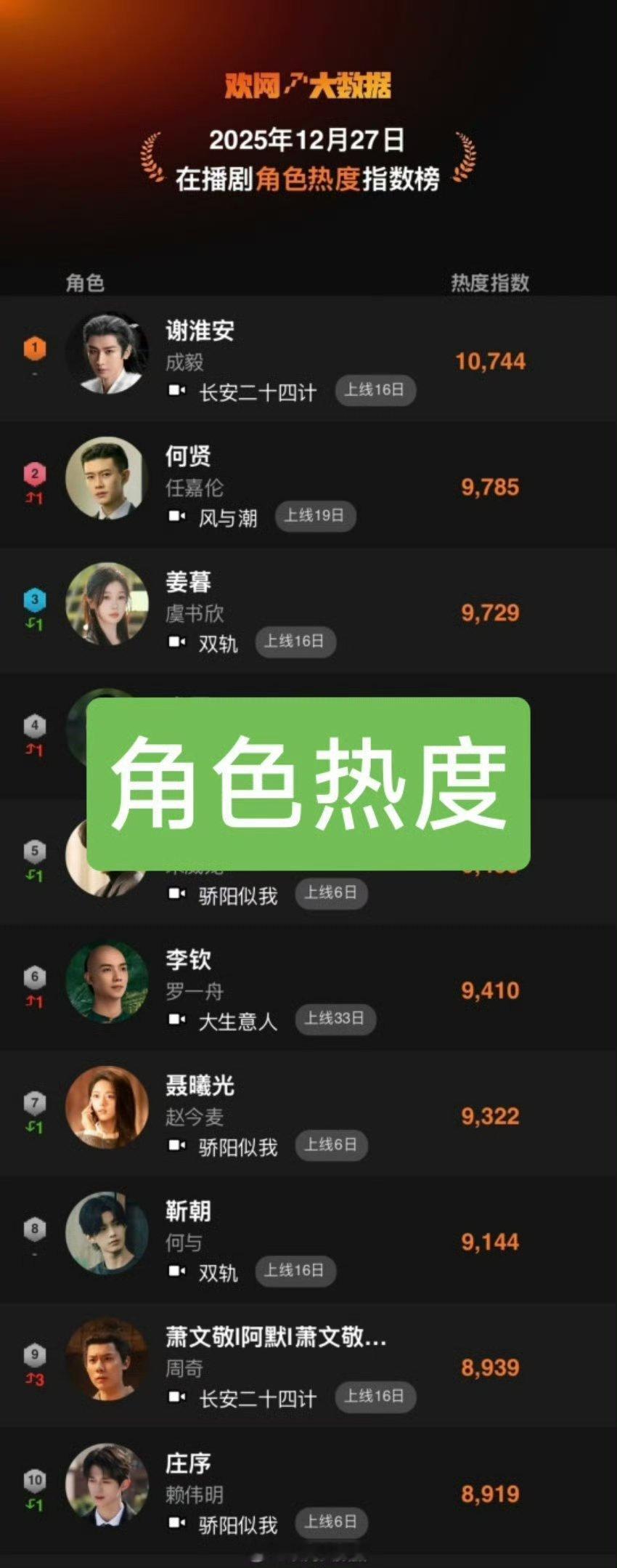 成毅《长安二十四计》又➕广了另外,欢网大数据在播剧角色热度指数:成毅长安二十四计成毅热度第一☝🏻