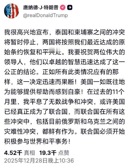 无论川普怎么说,这次不能相信他了。 我认为,这次柬泰停战,发挥主要作用的是中国,自从泰国和柬埔寨再生战端后,中国积极斡旋,多次派出特使前往泰国和柬埔寨,力促战火停息,并把当事双方请到云南昆明进行调解,成功签署停战协议。 川普在这个时候打冒吱儿,分明有邀功请赏之嫌,看来他对诺贝尔和平奖依旧念念不忘。 须知,诺贝尔和平奖不是在社交i媒体上发帖文就能获取的,更不是关税施压出来的短期停火,而应该知行合一,真正了解战事发生的根源,真心实意的致力于地区和平,以务实的态度维护世界发展与繁荣。