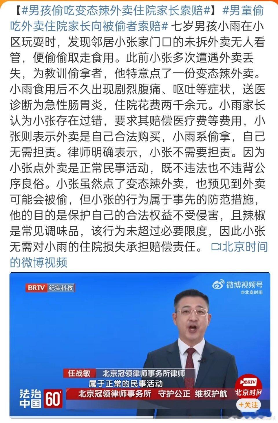 男孩偷吃变态辣外卖住院家长索赔法院的这个判决真的是大快人心。孩子当小偷偷别人的外卖还有理了?家长怎么有脸去告的?人家就是故意点变态辣,谁让你去偷吃,偷吃住院了也怪不到别人。