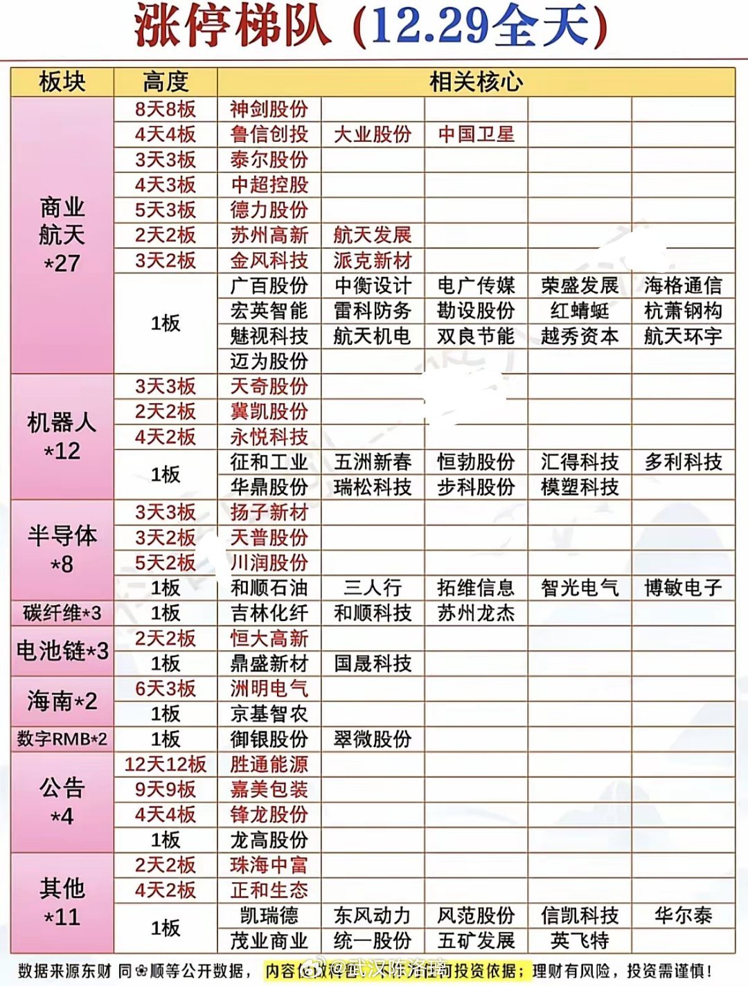 12.29涨停梯队:商业航天、机器人、半导体等板块强势股全解析!涨停梯队盘点: