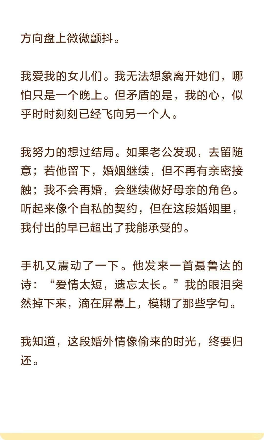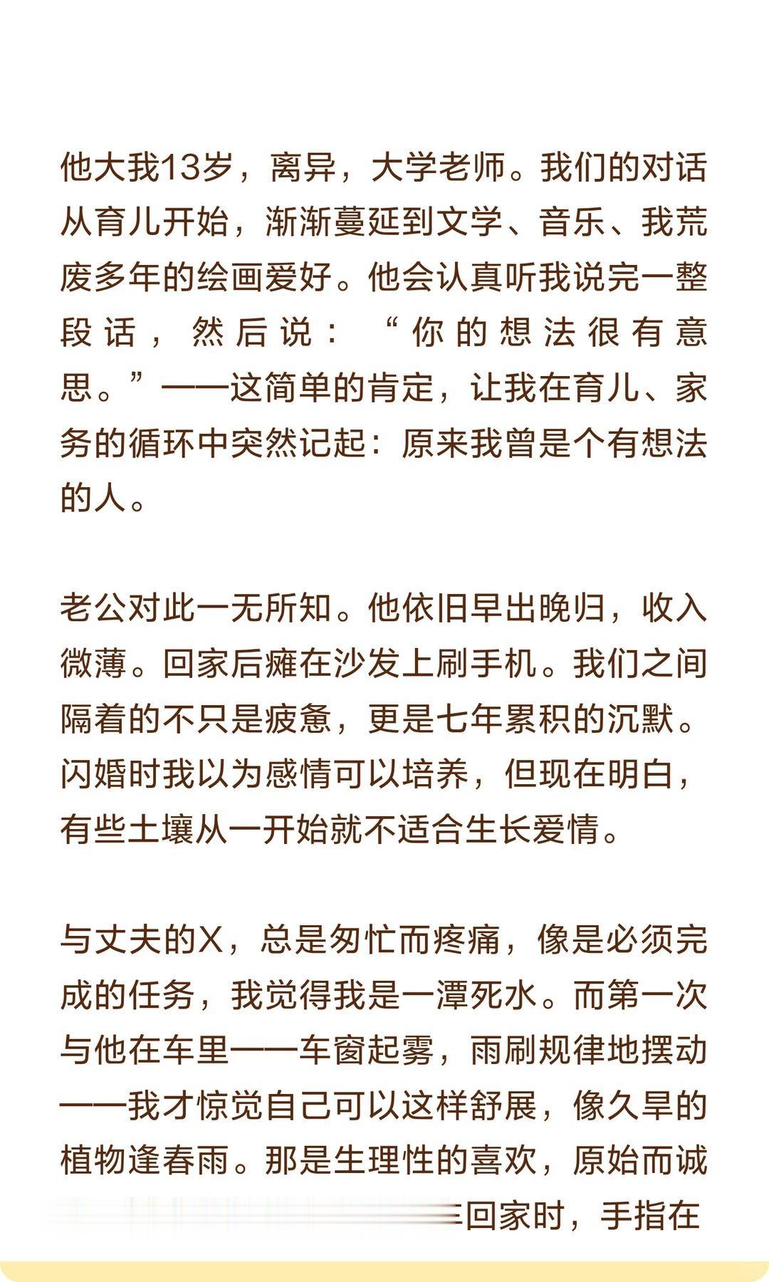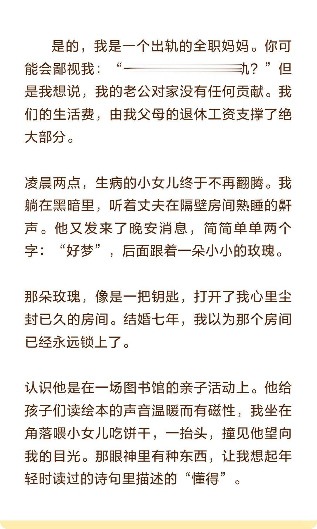 是的,我是一个出轨的全职妈妈。是的,我是一个出轨的全职妈妈。你可能会鄙视我:“一分钱不挣,还出轨?”但是我想说,我的老公对家没有任何贡献。我们的生活费,由我父母的退休工资支撑了绝大部分。凌晨两点,生病的小女儿终于不再翻腾。我躺在黑暗里,听着丈夫在隔壁房间熟睡的鼾声。他又发来了晚安消息,简简单单两个字:“好梦”,后面跟着一朵小小的玫瑰。那朵玫瑰,像是一把钥匙,打开了我心里尘封已久的房间。结婚七年,我以为那个房间已经永远锁上了。认识他是在一场图书馆的亲子活动上。他给孩子们读绘本的声音温暖而有磁性,我坐在角落喂小