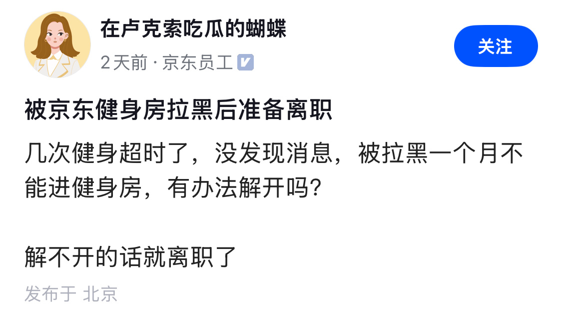 因为被公司健身房拉黑,京东员工准备离职。现在工作这么好找吗?