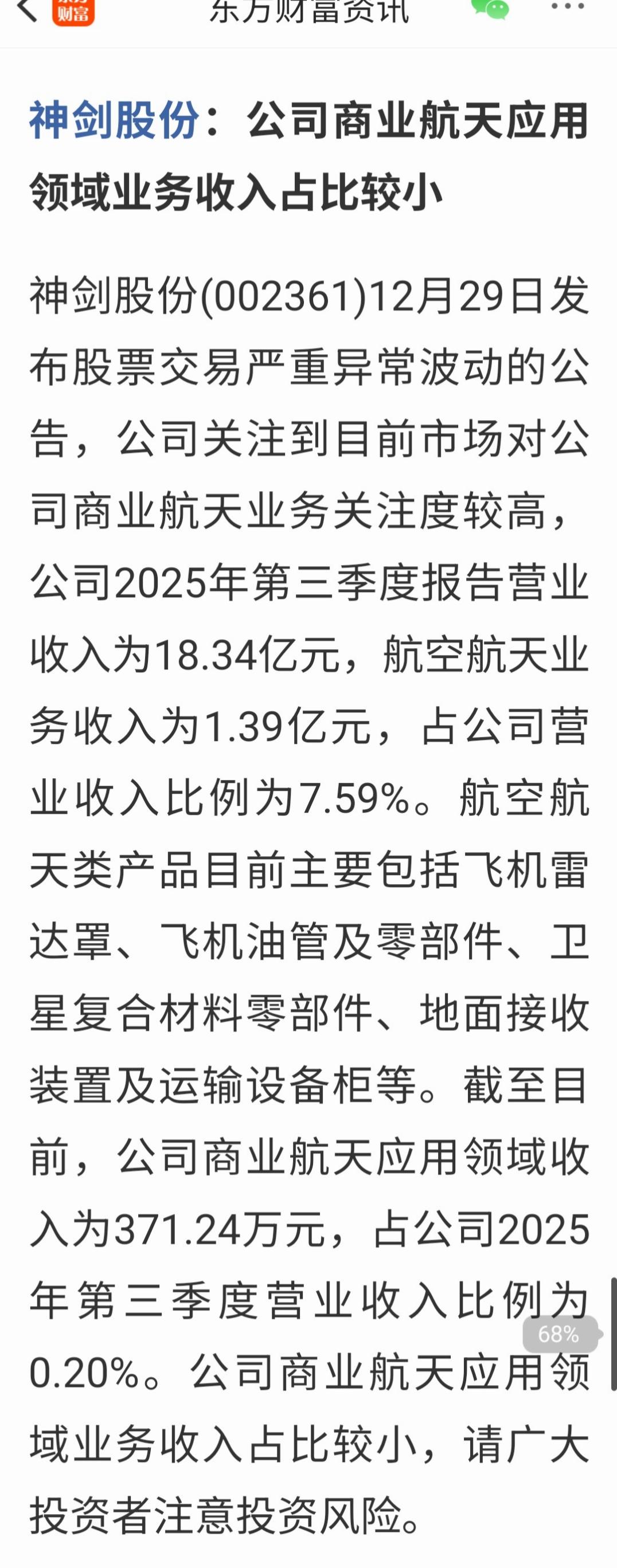 神剑股份凭什么成为商业航天最强补涨龙? 商业航天近两周最强补涨龙 神剑股份今天依然牢牢的封在8连板上,因为有两个一字板大哥带头,再加上商业航天的整个情绪高涨,被打造成了一只打破近两个月换手连板最高标。 可今晚看到公司的公告,今年前三季度营收18.34亿元,航空航天业务收入总共才1.39亿元,这其中包括了飞机雷达整流罩、油管和其他零部件,商业航天应用业务收入才371.42万元,占比0.2%。可就是这样的基本面情况,却能8连板。 有时候突然就迷茫了,越看基础资料就越不敢追着炒,可人家偏偏就是连续大涨,真正有核心东西的,营收占比大一些的,反而不见得就会涨。 这到底凭什么会这么涨?完全就是凭市场情绪你追我赶的给抬上来了,一旦情绪退潮,热💰突然撤离,没有真正核心东西的估计又是一地鸡毛。 不知道明天还有没有资金再敢去顶一字!