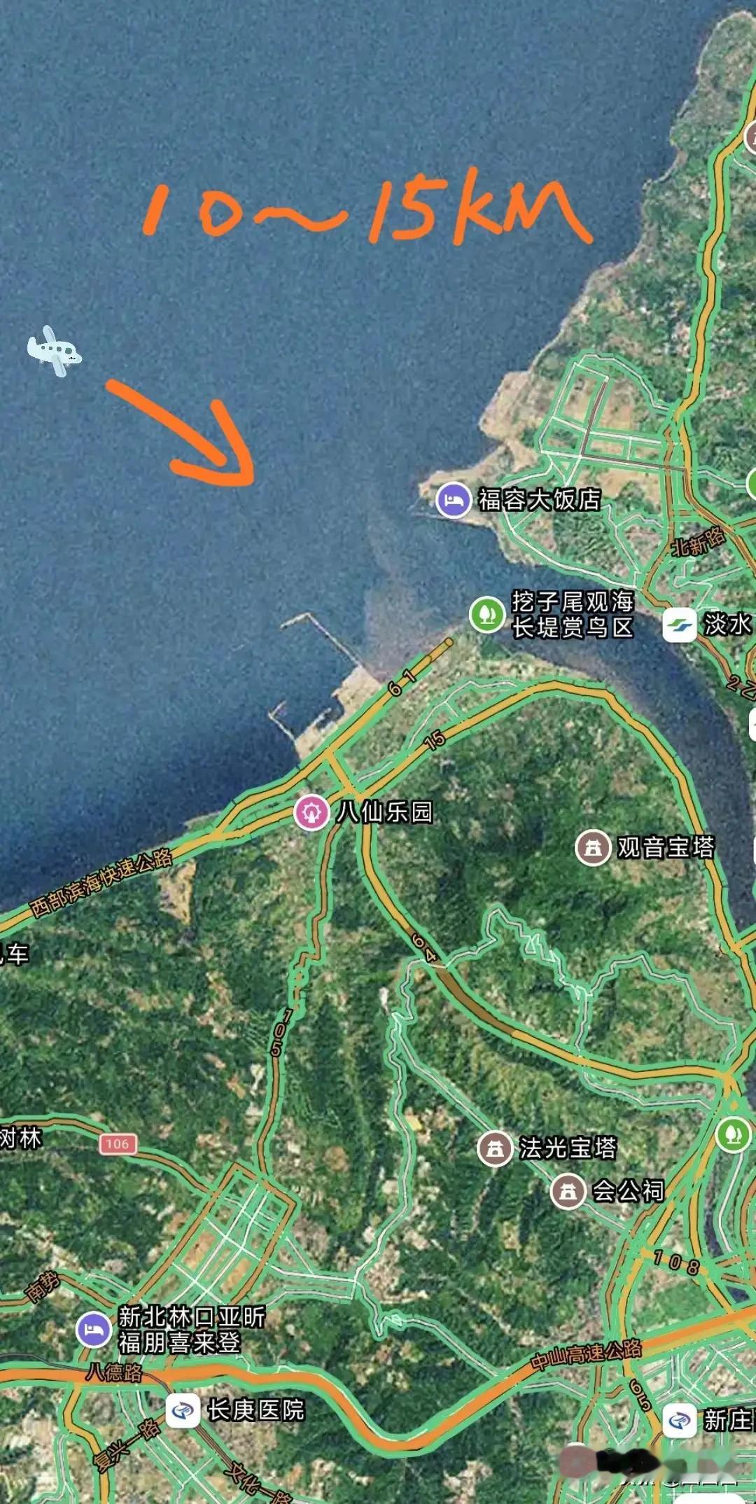 画像应该来自WZ7无人机的光电吊舱,这个距离大概离101大楼45-50km左右,距离台岛海岸线15-25km左右。101楼旁边的那个飞机剪影是松山机场起飞的民航飞机。 远侧中间是台北101大楼,101左边下面发亮的是小巨蛋。淡水河上远处的是关渡桥,近点的是淡江大桥,桥边水面上是八里的渡轮。 图片右下角的是台北港货运码头。右侧山为观音山。从台北港到台北101的直线距离是24公里左右,再根据台北港码头直线延伸到观音山的位置,无人机离台北港应该在10到15公里左右。拍摄时间为下午1-2时。右侧那架起飞的民航飞机是从桃园机场起飞的航班。[绝][绝][绝] 东部战区军演 舰机多向抵近台岛 东部战区:这么近那么美 随时到台北