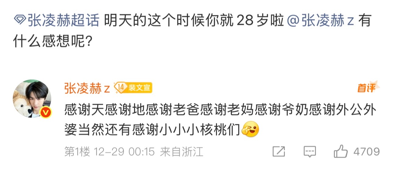 回看凌赫这几天超话的空降回复又想起来21年的今天他留下的心里话,记忆里好像是昨天的事居然恍惚过去了这么多年,凌赫却始终没变过。依旧是那个线下活动被提问“圣诞如果不在工作的话最希望和谁一起过”甜甜的笑着说“最希望和粉丝一起过,线下没有机会就线上见~”的哥哥,是那个12.25刚过零点就上线来找粉丝了,认认真真拍下一个苹果送上圣诞祝福、、主动跟小核桃说晚上再来,晚上在线陪了小核桃半个小时的圣诞老人。谢谢你成为张凌赫。如果世界上真有圣诞老人,希望你可以让哥哥能永远走在自己的时区里,拥有自由的节奏和灵魂。生日快乐张凌赫,希望越来越多的人能喜欢这样一个真诚又温柔的人。张凌赫1230生日快乐