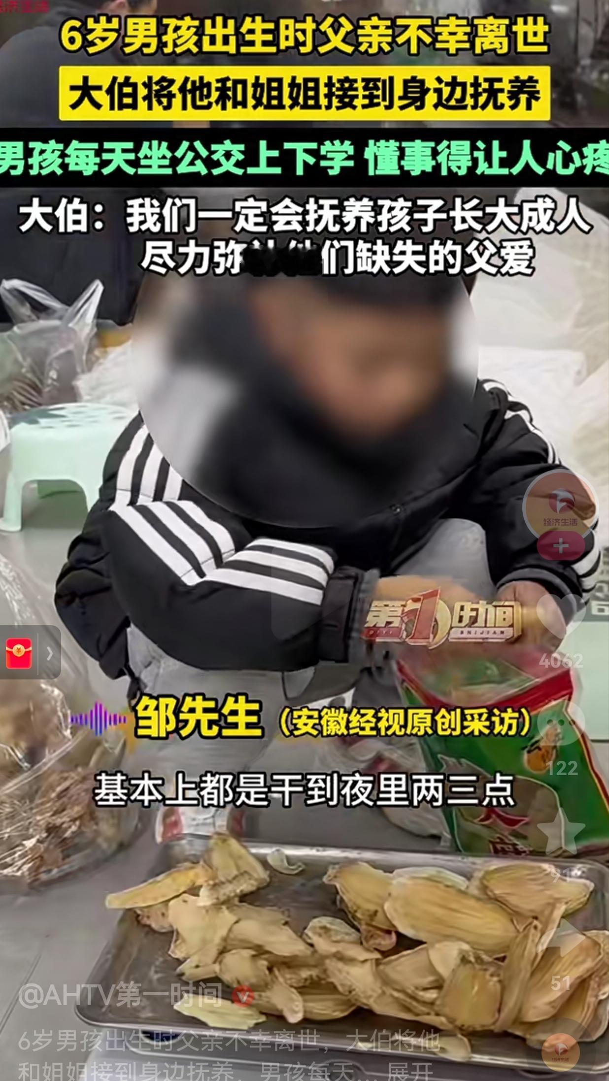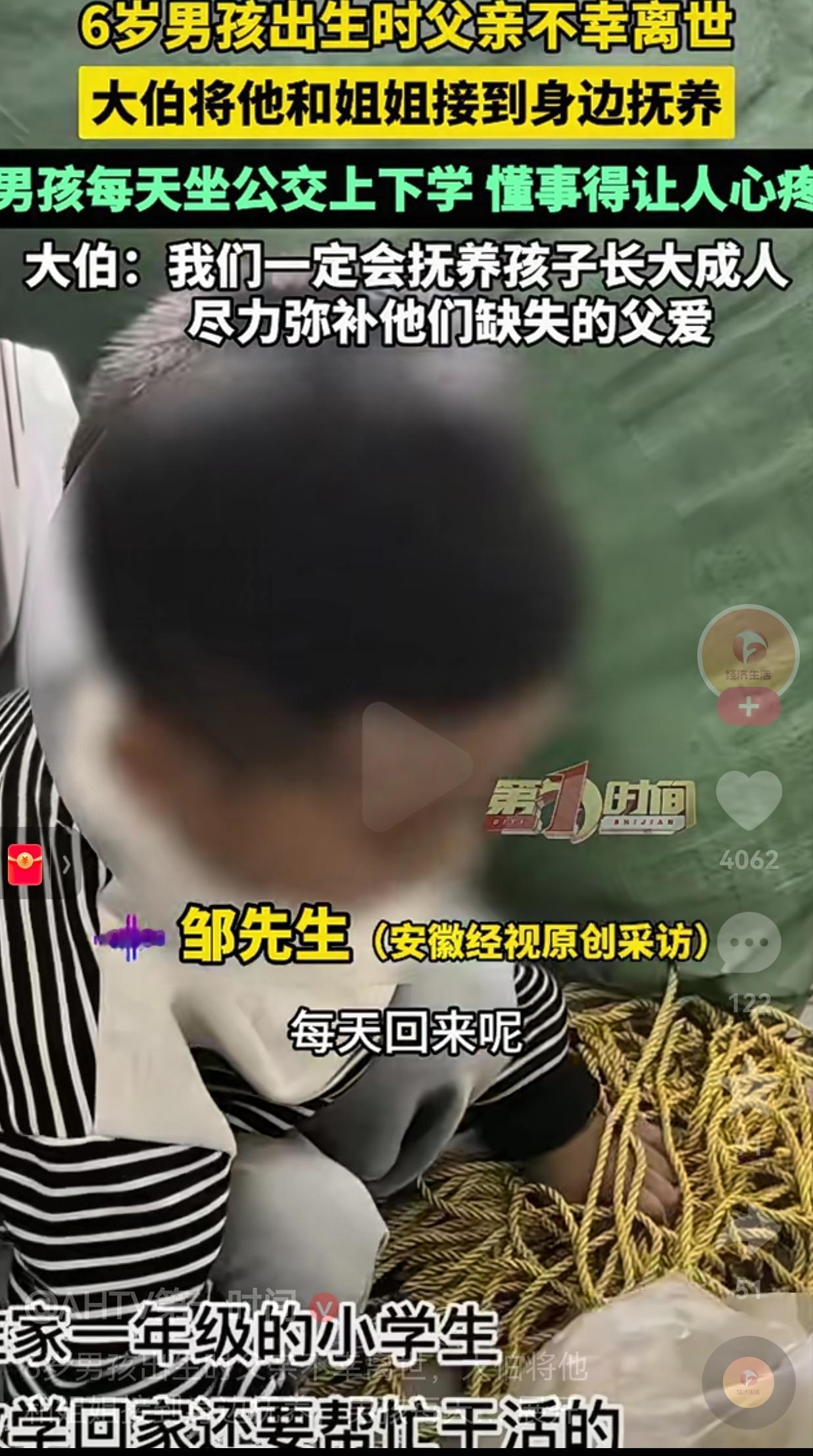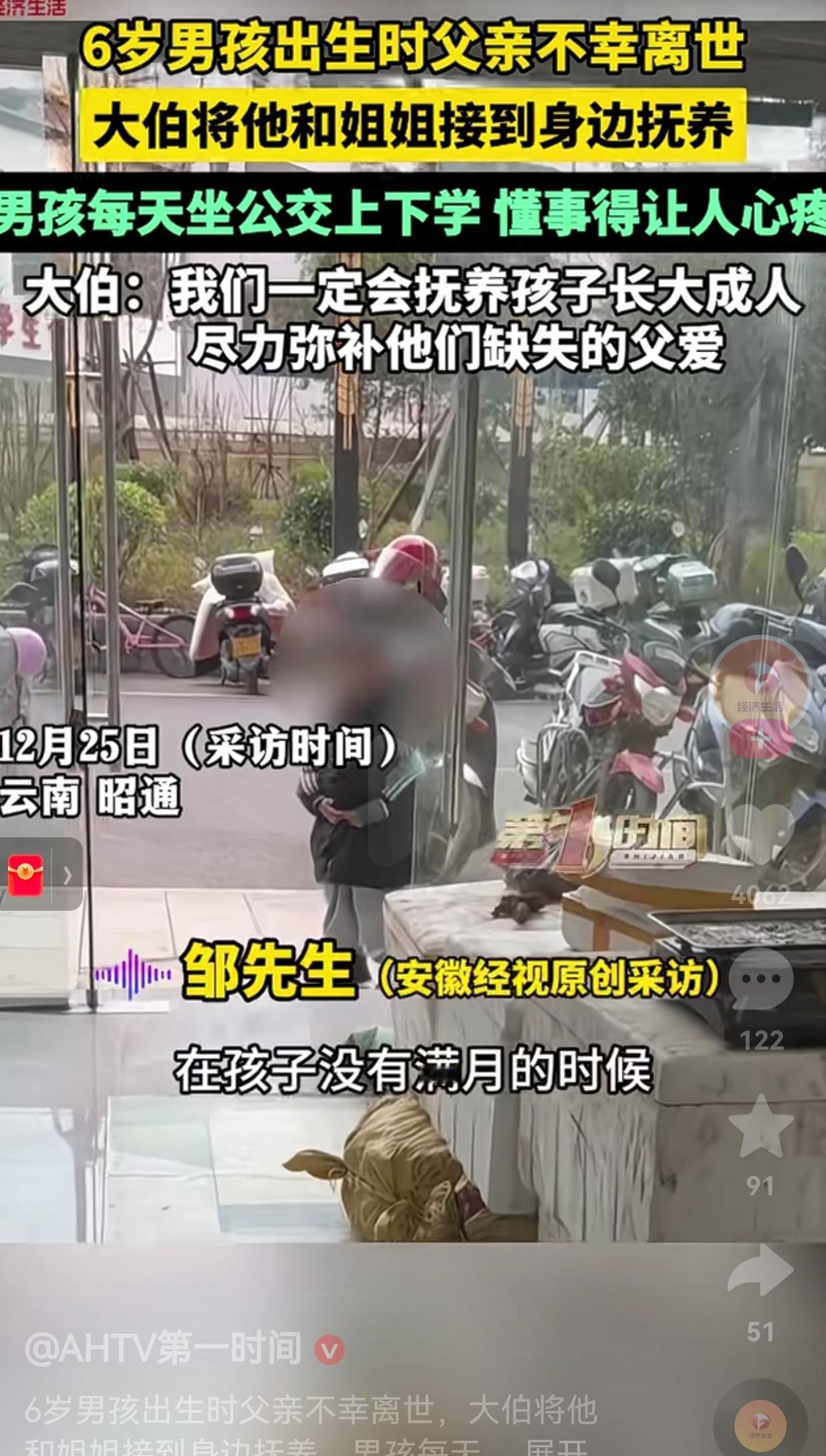 破防了!云南6岁娃出生时父亲不幸离世,自此以后,大伯将他和姐姐接到身边抚养,男孩每天坐公交车上下学,有空还会帮助大伯干活,懂事得让人心疼!网友:啥叫血浓于水?这就是!为邹大哥点赞,好人一定有好报! 云南昭通的冬天,天亮得晚,每天早上公交站台上,一个小小的身影缩在厚外套里,背着快比自己宽的书包,踮着脚尖够公交刷卡机。 这娃刚读一年级,才6岁,每天一个人坐公交上学放学,动作熟练得让人心疼。 没人知道,这个懂事的孩子,打从出生没满月,就永远失去了爸爸。 他爹走后,大伯邹大哥二话没说,直接把侄子侄女接到了自己的家里。 据邹大哥讲述:“加上我自己俩娃,一家四口呢,总不能让孩子们饿着肚子、没学上!”邹大哥这话听着糙,可做起来全是实打实的难。 一家人靠小生意糊口,白天忙得脚不沾地,晚上还得接着干,常常熬到凌晨两三点才收工。累得第二天早上眼皮都睁不开,哪还有功夫送孩子上学? 就这样,6岁的小娃早早学会了扛事儿。每天天不亮就爬起来,自己收拾书包往公交站跑,从不哭着喊着要大人陪。 更让人心疼的是,这孩子放学一到家,看见大伯一家忙得团团转,立马颠颠跑过去搭把手。搬小物件、扫地,小手冻得通红,也一声不吭。 邹大哥说起侄子,声音都发闷:“这娃太懂事了,屁大点儿年纪,就知道帮衬家里。” 村里有人劝他:“又不是你亲生的,揽这么大担子,图啥?不累得慌?” 邹大哥摆摆手,顺便提了嘴:“说啥傻话!都是一家人!他爹不在了,我这个当大伯的不扛,俩娃咋办?” 他拍着胸脯保证,肯定把侄子和侄女抚养成人,“得让他们知道,家里永远有人疼,永远有个落脚的地方。” 此事传到了网上,引发无数网友的热议。有的网友说:“看得我眼泪哗哗的,这大伯就是孩子的天!亲爹也不过如此啊!” 还有的网友说:“6岁的娃,换我家的还在撒娇呢,这孩子太乖了,乖得让人心疼!” 也有的网友说:“有没有啥渠道能帮一把?哪怕给孩子捐点文具和衣服也行啊!” 这世上的爱,哪只局限在亲生骨肉之间?邹大哥就靠一双磨出老茧的肩膀,扛起了弟弟留下的血脉,给了两个孩子一个温暖的家。而那个独自坐公交、默默帮干活的小男孩,正用小小的身板,回应着这份沉甸甸的爱。 咱总说日子苦,可总有那么些人,在苦日子里掏出滚烫的心,护住身边人。 邹大哥没说过啥豪言壮语,可他做的这些事,让全网看明白了:最真的善良,是见不得亲人受委屈;最重的责任,是把自己活成一堵遮风挡雨的墙。 希望这个懂事的小娃,往后的日子全是甜。也希望邹大哥的辛苦,以后都能换来好日子。毕竟,心肠好的人,就该被生活温柔以待。 针对此事,你有什么看法呢?