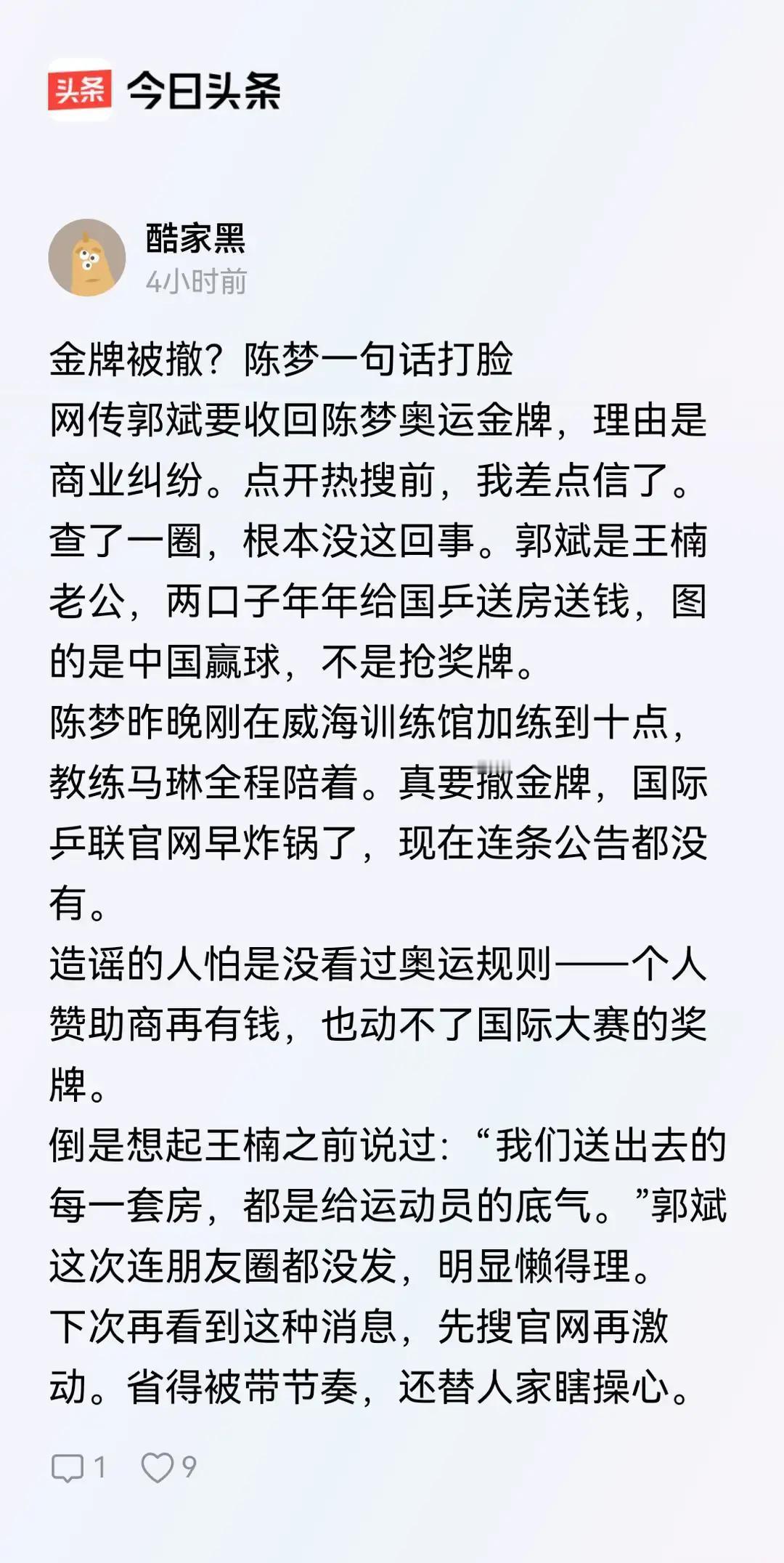 陈梦金牌被收回?假消息! 国际乒联官网昨天刚更新,陈梦名字还在冠军榜。威海基地训练视频里,她正跟马琳练反手斜线,球拍还是那支红双喜狂飚。 金牌真要收回,得走三步:国际奥委会纪律委员会立案、运动员申诉、最终裁决。这套流程走完至少半年,现在连风声都没有。 造谣的人算准了信息差。乒超联赛12月28日决赛,他们提前五天编出2比0假比分,还把平野美宇换成孙颖莎。普通人哪记得清具体日期和外援名字。 这种谣言最损的地方在于,它先编个离谱开头,再用细节造假让人信以为真。就像先喊你家房子着火,再说烧的是厨房还是卧室。 刷到这类消息,先去中国乒协微博搜最新训练照。昨天刚发的陈梦拉筋视频,背景就是威海基地的蓝色挡板。