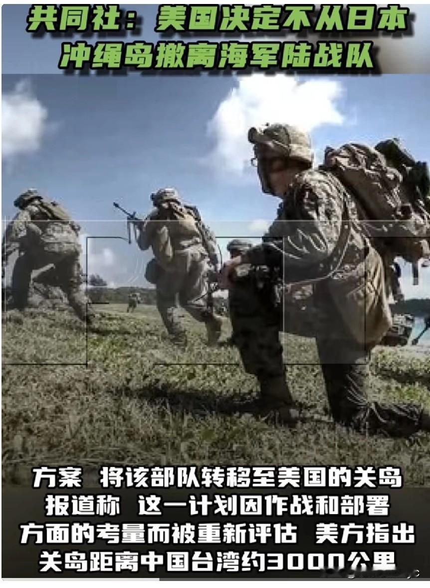 近日共同社报道,美国决定不再推进从日本冲绳岛撤离一支海军陆战队团的计划。此前,美方曾计划根据削减冲绳美军驻扎规模的相关方案,将该部队转移至美国的关岛。 报道称,这一计划因作战和部署方面的考量而被重新评估。美方指出,关岛距离中国台湾约3000公里,而冲绳距离中国台湾仅约500公里,驻扎在冲绳能够大幅缩短部队的部署时间。 冲绳岛集中了美国在日本约70%的军事设施以及几乎全部作战部队。 美军临时叫停原定从冲绳撤走近半陆战队员的计划,仅象征性转移百余名后勤人员,作战部队继续留驻,引发对台海紧张升级的广泛猜测。 日美2024年6月达成共识,计划将冲绳约1.9万名美海军陆战队员中的9000人转移海外,其中4000人移防关岛、5000人撤回夏威夷及美国本土,首批后勤人员已于2024年12月启动转移。 美军2025年10月更新《兵力设计》文件,宣布暂停转移驻冲绳施瓦布营的第4陆战团步兵部队(原定改编为“濒海战斗团”部署关岛),仅百余名后勤人员按计划撤离,主力作战单位继续留驻冲绳第三远征军序列。美方解释称此举为“展示对敌对势力采取重大行动的态势” 美军内部评估认为,冲绳距台湾仅约500公里(关岛约3000公里),留驻部队可更快响应“台海突发事态”;转移至关岛后因解放军远程打击能力覆盖关岛,战术价值降低。 同时,推动盟友“代理人化”:美军同步加速组建“濒海战斗团”,配备反舰导弹(如NSM系统)、攻击型无人机等装备,意图依托日本构筑分散火力节点,将自卫队推向冲突一线。 与此同步,日本借机加速军事扩张,增设弹药库、囤积战略物资;中方则通过航母编队巡航、远洋训练等行动强化反制,地区军备竞赛风险上升。 中国军事专家指出,美军留驻暴露其“不愿为台牺牲”本质,同时警告外部干涉必遭挫败。