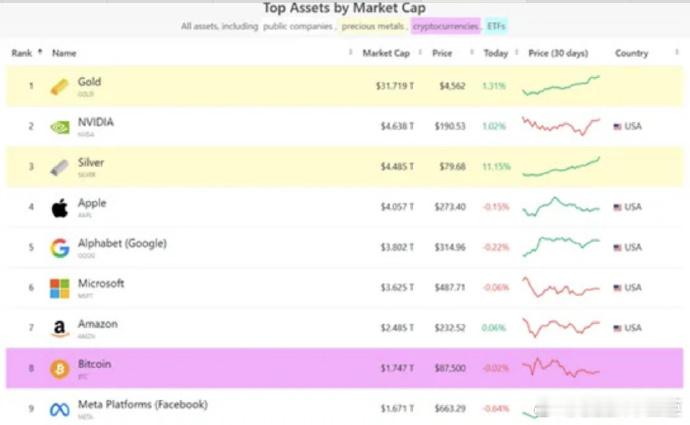 白银升为全球第三大资产随着白银价格不断攀升,目前该贵金属市值已超越苹果,晋升为全球第三大资产,仅低于黄金和英伟达。