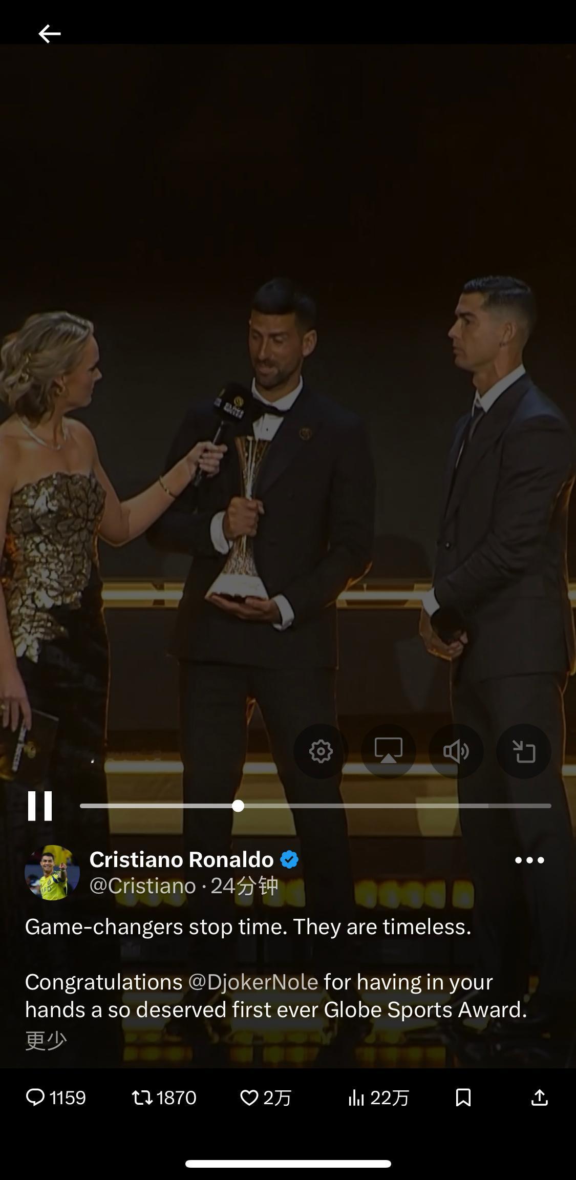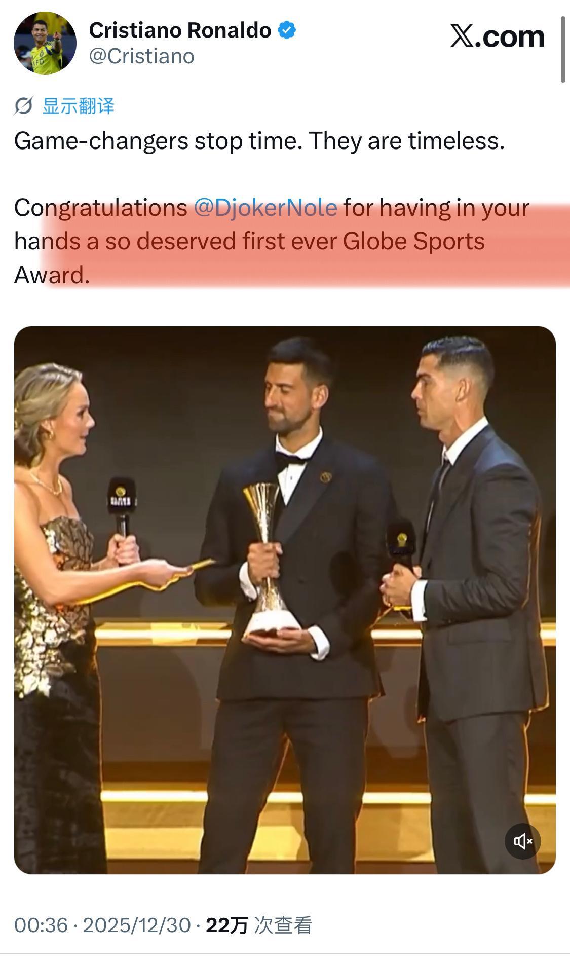 C罗为德约颁奖 罗还特意发帖恭喜德约获奖呢德约荣获环球体育奖