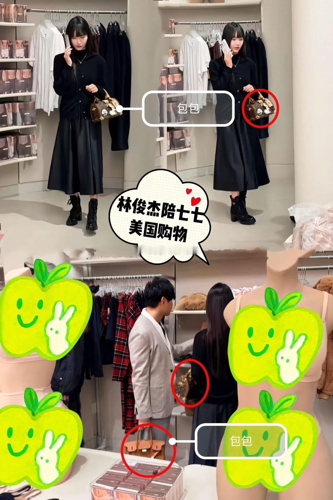 林俊杰官宣恋情林俊杰陪七七美国购物,两人一人拿一个包包。林俊杰在美国连续两天被偶遇跟网红七七逛街,第一天两人穿情侣装,现在又陪女孩买女装,林俊杰跟七七一人拿了一个包,林俊杰手上的女包应该是帮女友拿的,很贴心