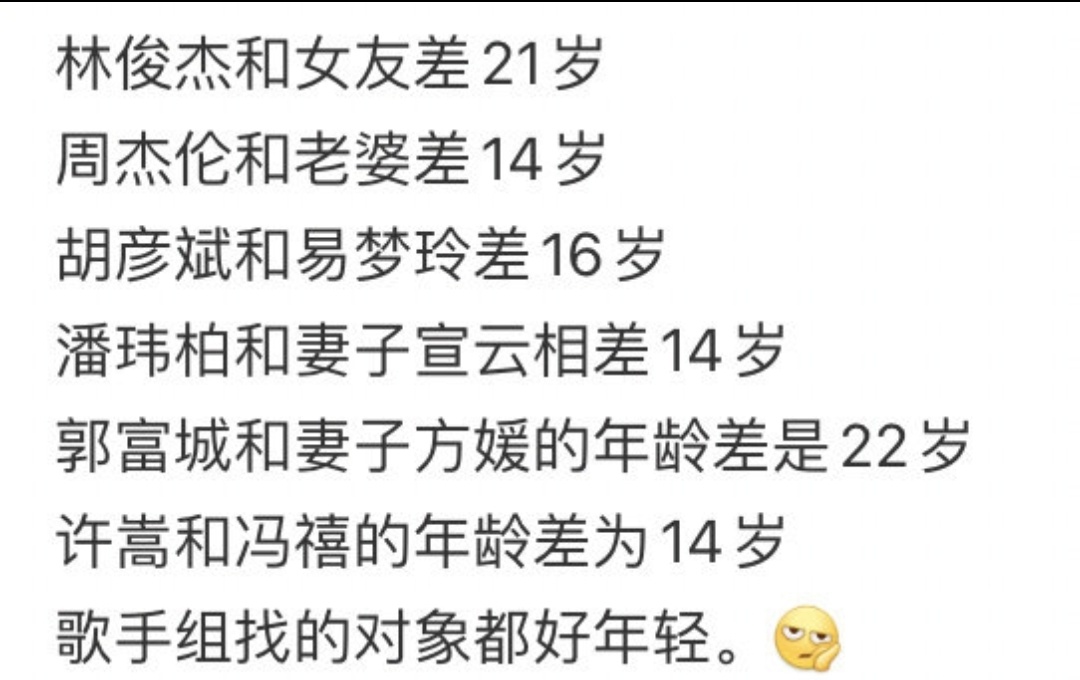 林俊杰官宣恋情华语乐坛“老少恋”直接砸脸上。44岁林俊杰在妈70大寿全家福里,公开了自己的小女友,被网友发现,疑似是23岁网红七七!这21岁年龄差,网友笑称“老牛吃嫩草”,扎心了老铁!但要说这是孤例?错了!周杰伦31岁追17岁昆凌,胡彦斌38岁恋22岁网红,许嵩34岁娶20岁主持人,个个把“老牛吃嫩草”玩成日常。其实说白了,不就是某些中年男人的青春梦嘛!找个年轻女孩,图的就是那份活力和纯粹,哪怕被吐槽,依然挡不住人,那就是真爱。