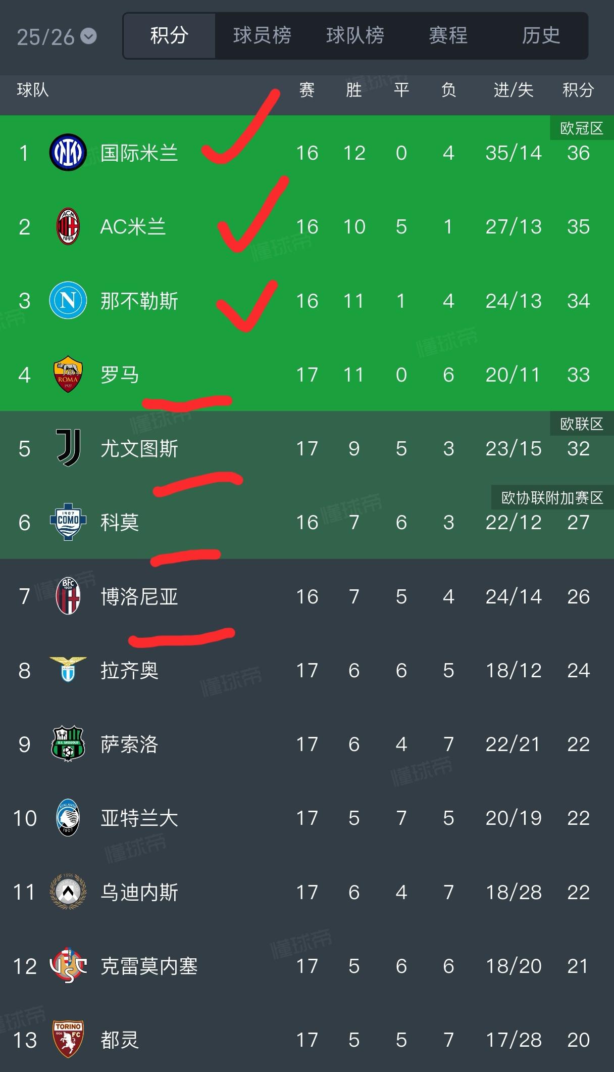 随着罗马3-1战胜热那亚,意甲最新积分榜出炉!争冠集团逐渐明朗,米兰双雄+那不勒斯将是本赛季意甲冠军的有力争夺者!而欧战资格,罗马、尤文图斯、科莫和博洛尼亚将竞争最后一个欧冠的席位!最近几个赛季的欧冠常客亚特拉大本赛季在意甲表现糟糕,目前落后意甲第四的罗马11分,重返欧冠区难度不小! 本轮意甲积分榜前六的球队全部获胜,且都没有丢球,这表现出了意甲头部球队的强大实力,也表明意甲强弱分明的特点!国米1-0战胜亚特兰大,AC米兰3-0完胜维罗纳,那不勒斯2-0克雷莫内塞,争冠的这三支球队都没有出现掉链子的情况!接下来的一月份赛程非常紧张,意甲将迎来连续的一周双赛,而欧冠的比赛也会重新开踢,国米和那不勒斯在意甲也将直接交手,这场比赛很可能决定本赛季意甲冠军争夺的走向,是国米顶住压力继续领跑,还是单线作战的米兰趁机登顶,或者是善于内战的那不勒斯重新登顶,让我们拭目以待吧!