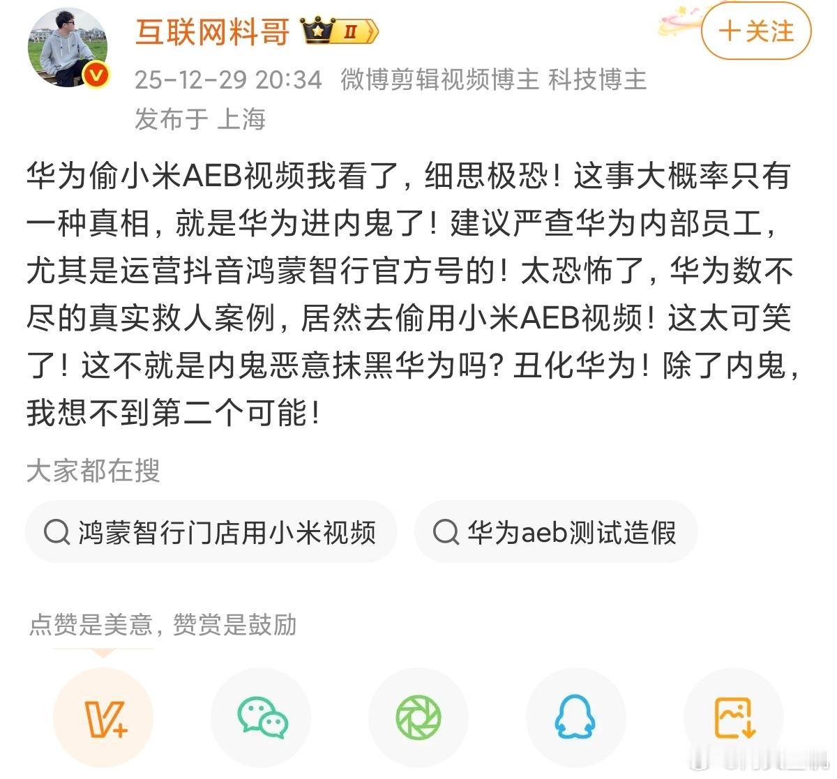 互联网料哥堪称毒瘤啊,建议早做切割,这人留不得,太容易翻车。就鸿蒙智行旗下批量账号发小米汽车aeb主动刹车改成自家产品这个事,居然也能这样洗,把责任归咎于“有内鬼”,就和那些一出事儿就推给临时工的企业一样,如果一个号有问题,为什么齐刷刷地出现批量账号发,难道哪个内鬼有这个能力可以操纵那么多地区的汽车销售账号?我猜测,他们改字幕的时候以为别人看不出来,然后转发的那群人又辨别不了是不是自家产品,就接个任务发一下,谁能知道这事儿居然被广大网友识破曝光出来,只能说做视频分发任务的那哥们要倒霉了。数码科技评论