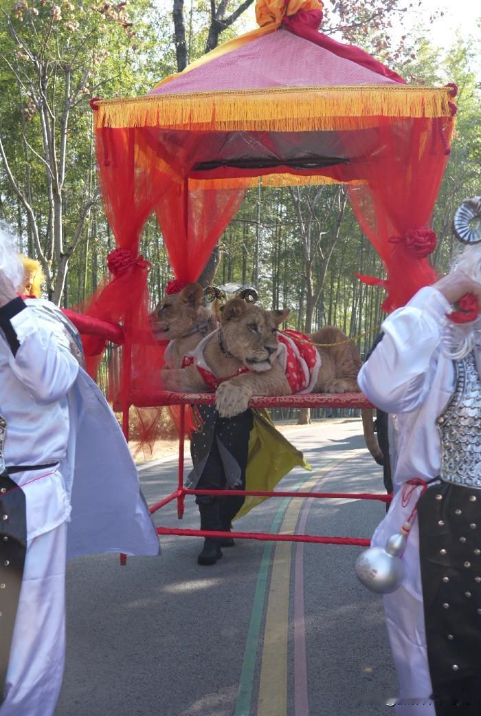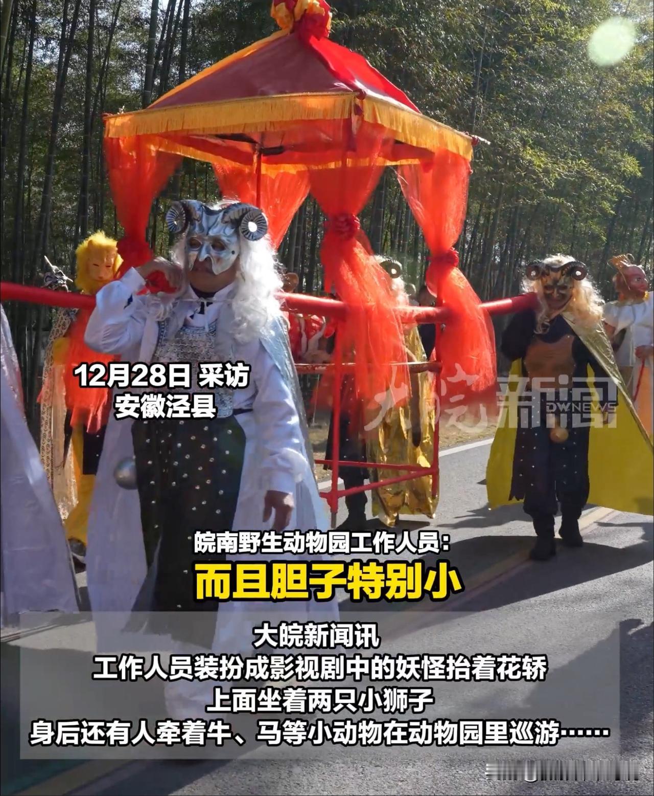 动物园的赛道还是来到了真人秀,狮驼岭既视感有没有?安徽泾县的皖南野生动物园为了给元旦增加戏份吸引游客,特地找来了众多NPC扮演妖怪巡山,而且还抬着两头又肥又壮的真狮子。值得注意的是,这些NPC的装扮和造型感觉是按照老版西游记来的,看起来仿佛一下子走进了西游世界。那么问题来了,万一这两头狮子被熊孩子给惊扰了,会不会惊慌失措?