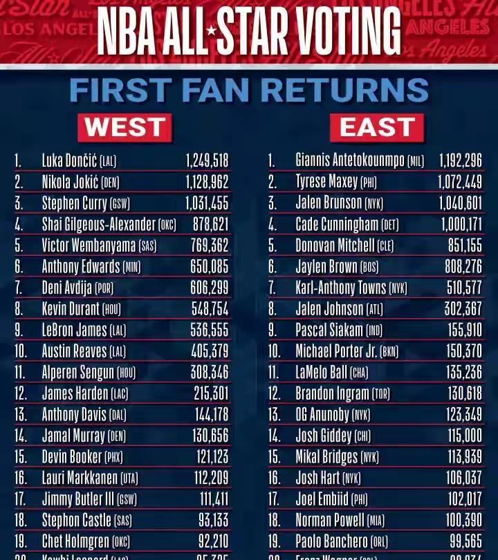 三大意外!全明星球迷首轮投票结果新鲜出炉! 一早醒来,NBA官方宣布了全明星球迷首轮投票结果,有三点让人意想不到: 1.没想到啊,东契奇会这么炙手可热,成为全联盟票王,领先与近期球迷提议的东契奇换字母哥,字母哥排东部第一 2.没想到啊,詹杜库三人排名如此靠后 除了库里进了前五,位居西部第三,杜兰特仅排西部第八,詹姆斯仅排西部第九,联盟大小王人气这么低了吗? 尤其是詹姆斯,完全被东契奇光环覆盖了,难怪湖人队管理层任意踩詹姆斯。 3.想不到啊里弗斯人气这么高,紧随詹姆斯位居西部第十,如果不是受伤,小里弗斯大概率进入全明星,该怨谁呢?!