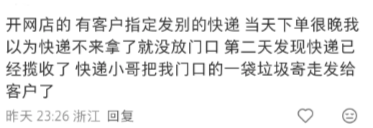 有客户指定发别的快递当天下单很晚我以为快递不来拿了就没放门口第二天发现快递已经揽收了快递小哥把我门口的一袋垃圾寄走发给客户了