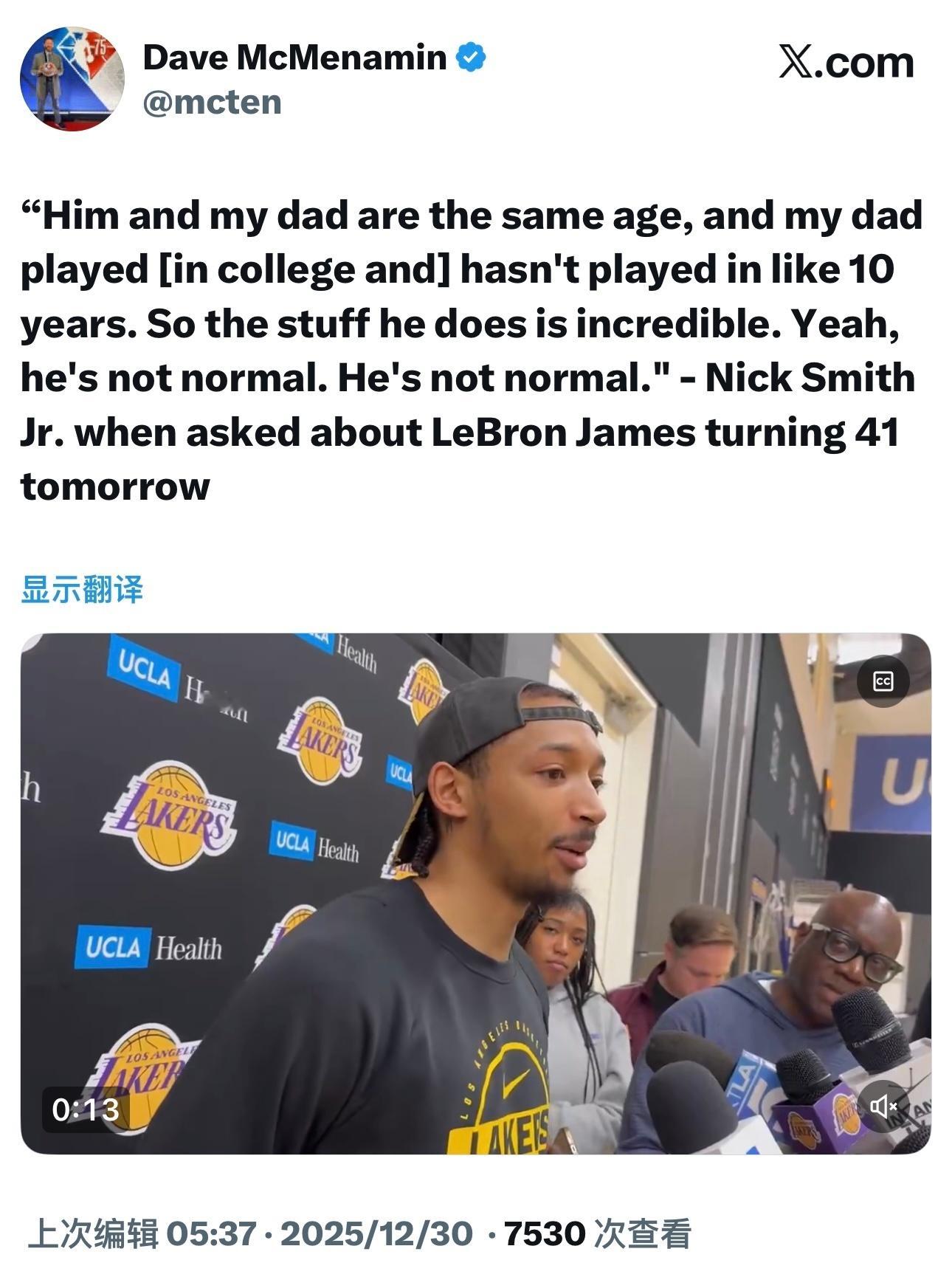 尼克-史密斯谈即将41岁的詹姆斯:他和我爸爸同龄,但差不多有十年没碰过篮球了。所以勒布朗现在还能打出这样的表现,简直太不可思议了。没错,他不是普通人,他真的不是普通人。